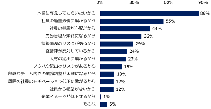 副業・兼業を禁止している企業に理由を伺うと、86%と多数の企業が「本業に専念してもらいたいから」と回答。続く「社員の過重労働に繋がるから」(55%)も過半数が回答しました。