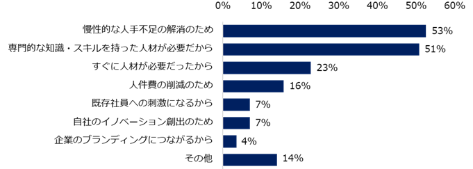 ・まずは人材不足を解消するために受け入れたが、副業人材を受け入れたほうが人件費の軽減につながる。業務を委託した場合も、業者に依頼するよりもコストが抑えられている。(サービス/50~99名)