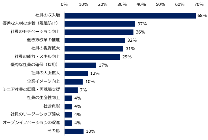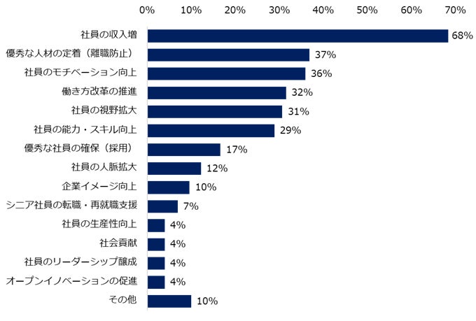認めている理由を伺うと、最も多かったのは「社員の収入増」(68%)でした。ほか上位には「優秀な人材の定着(離職防止)」(37%)、「社員のモチベーション向上」(36%)があげられました。