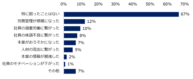 困ったことについても伺うと、最多は「特に困ったことはない」(67%)でしたが、「労働管理が煩雑になった」(12%)、「社員の過重労働に繋がった」(10%)が続きました。それぞれ、具体的な声も紹介します。