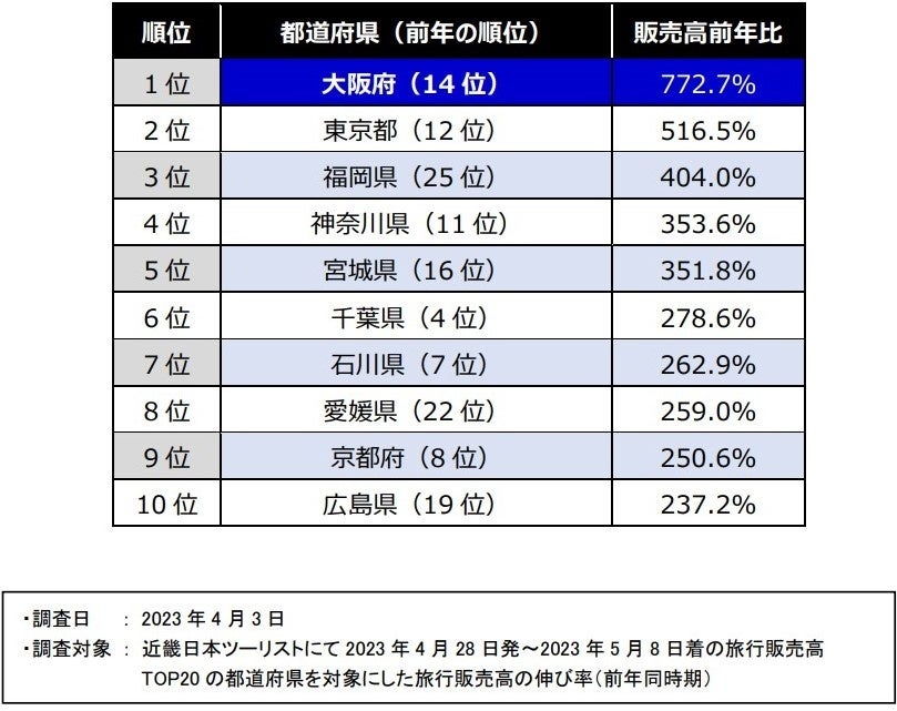 伸び率では、昨年と比較し大阪府が約7倍以上、東京都が約5倍と大幅に増加。地方居住者の都市部への旅行が急激に回復していることが分かります。また、九州を代表する人気観光地・福岡県や、横浜・鎌倉・箱根など、人気エリアが点在する神奈川県、日本三景に数えられる松島や秋保温泉、作並温泉など有名観光地が多くある宮城県といった定番の観光エリアが軒並みランクイン。お子様連れのファミリーはもちろん、幅広い層が訪れる定番の人気エリアも今年は多くの観光客で賑わいを見せそうです。