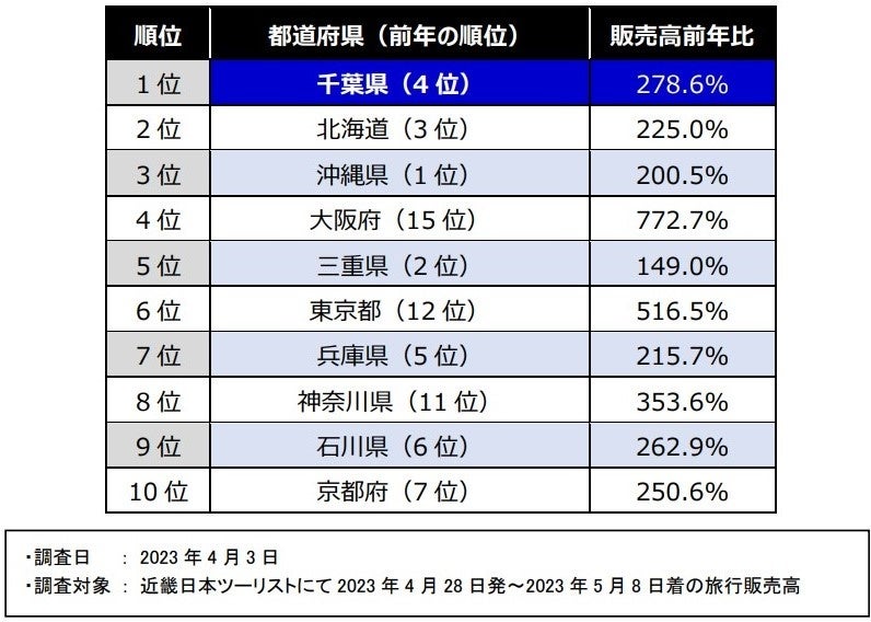 国内人気旅行先ランキングでは、「東京ディズニーリゾート」への観光客が多い千葉県が1位を獲得したほか、大自然、温泉、グルメなどの魅力が満載の北海道が2位にランクインし、GW定番の人気スポットの沖縄県が3位にランクイン。そして、4位には「ユニバーサル・スタジオ・ジャパン」への観光客が多い大阪府となりました。