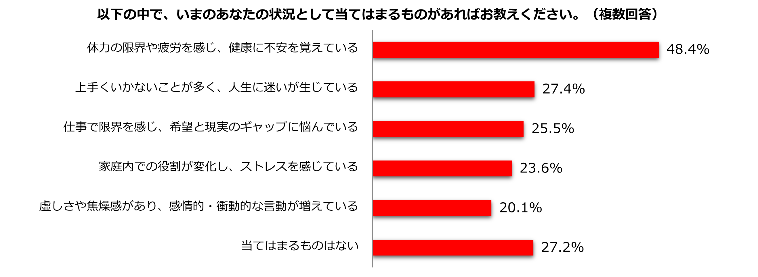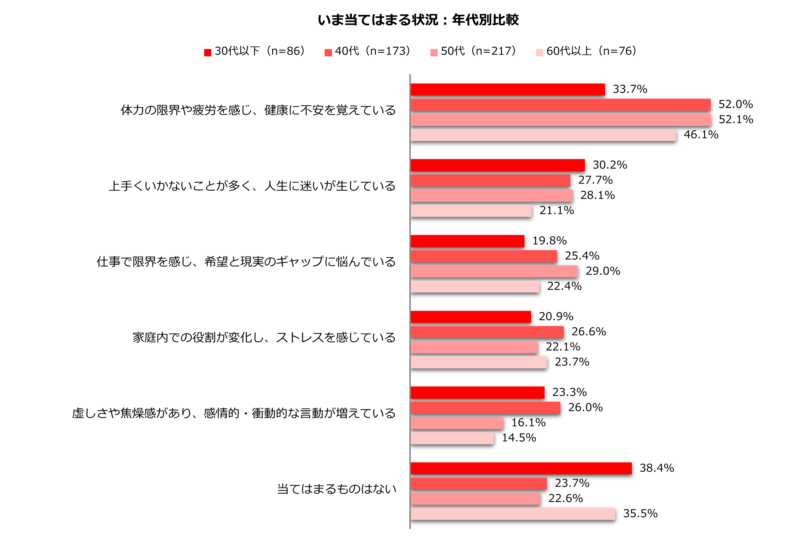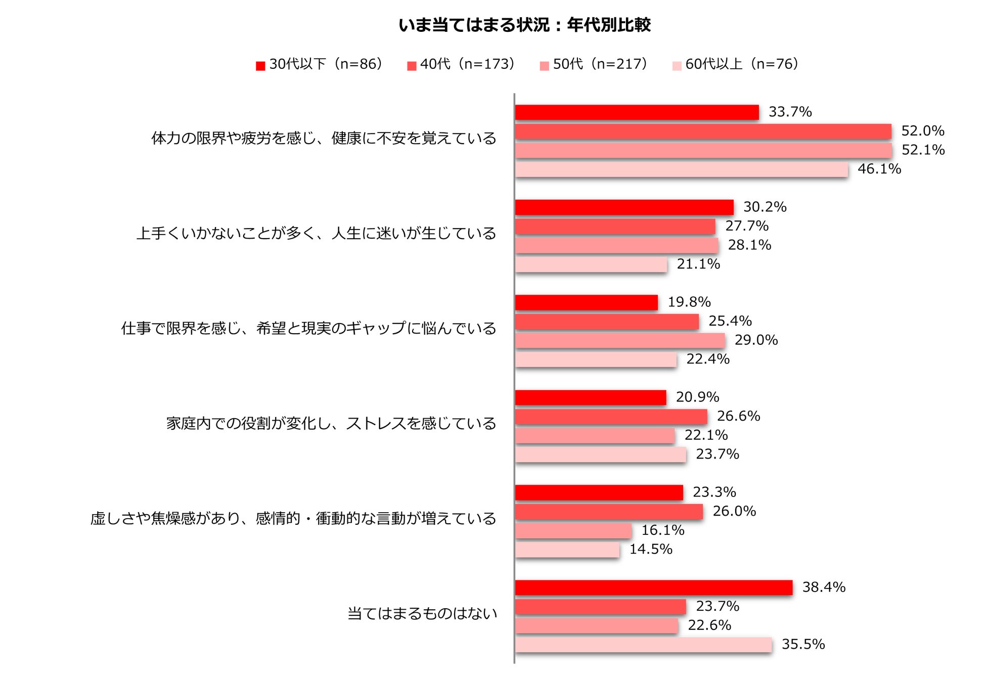 また、ミッドライフクライシスの症状に該当すると思われる項目を並べていまの状況に当てはまるか尋ねたところ、「体力の限界や疲労を感じ、健康に不安を覚えている」が48.4%と最も多くなりました。年代別で比較すると「体力の限界や疲労を感じ、健康に不安を覚えている」と答えた人の比率は40代・50代で5割を超えています。一方、「当てはまるものはない」は40代・50代とも他年代より低くなりました。フリーコメントには「今まさに悩んでいる」「ミッドライフクライシスだったのかと納得した」といった声がある一方で、更年期も含めて現状をどう把握して良いのか戸惑う声も聞かれました。ミッドライフクライシスかもと過度に意識してしまわないよう注意を払いつつも、年代によって心身の不調を感じやすくなる可能性があることも把握しておくことで、気持ちを穏やかに過ごしやすくする一助となればと願います。