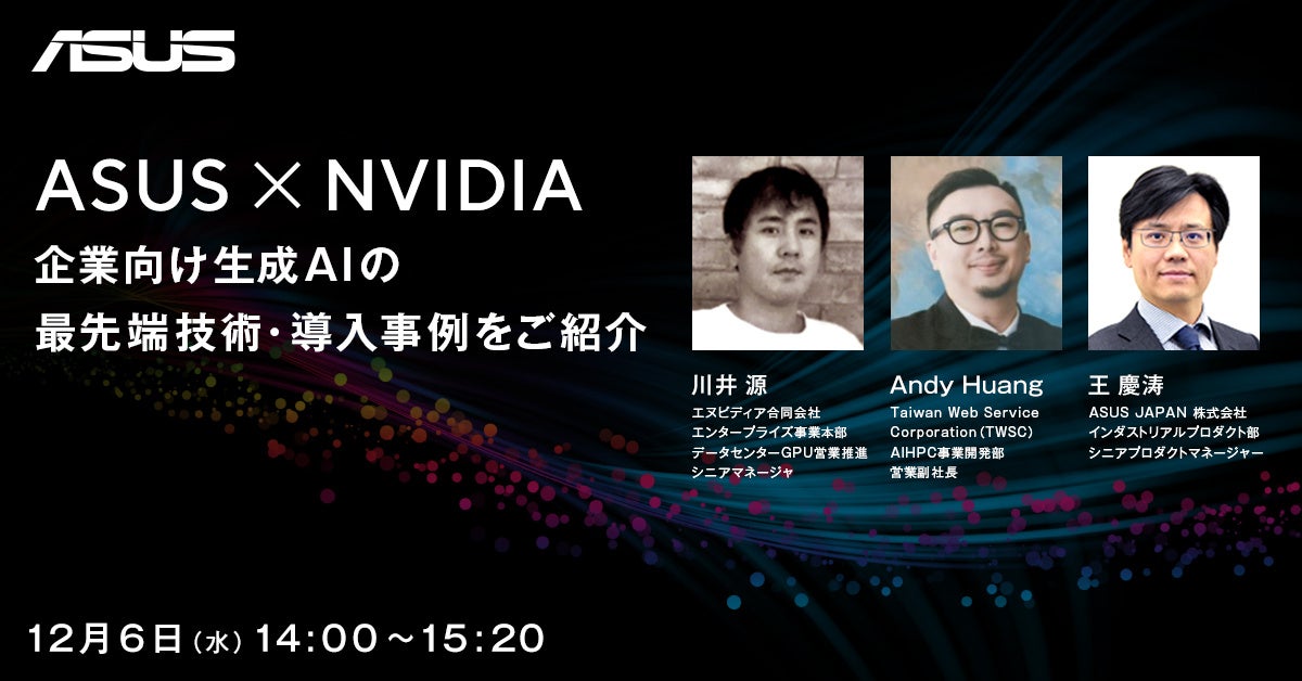 生成AIは、あらゆる業界のビジネスの未来を変革しています。このウェビナーでは、ASUSとNVIDIAと共に、生成AIに関する最先端情報をお届けします。NVIDIAの最新GPUとソフトウェアソリューションの紹介だけではなく、ASUSがどのように企業やAIプラクティショナーがAIモデルを構築・展開し、クラウドベースのインテリジェント・アプリケーションを迅速に有効化・採用し、運用コストを削減し、研究開発リソースの効率を向上させることができるかなど、様々な初公開情報をご紹介しますので、ぜひご参加ください。