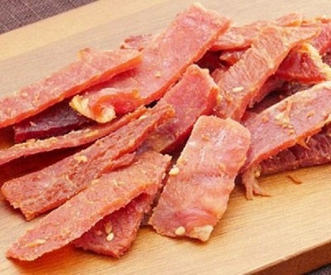 豚モモ肉を生姜焼き風味のタレに15時間以上漬け込み、乾燥させ、食欲そそる風味に。