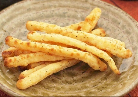 チーズに黒胡椒を付け、こんがりとした焼き色をつけました。食感はやわらかで、チェダーチーズ、クリームチーズ、カマンベールチーズパウダーの3種類をブレンドした濃厚な味わい。
