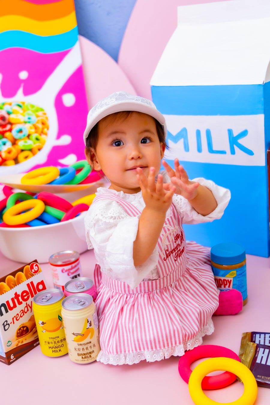 衣装も柄にこだわり、キュートな店員さん風のエプロンに。レースのキャップで軽やかさを取り入れ靴下はパキッとしたお色味でワンポイント!