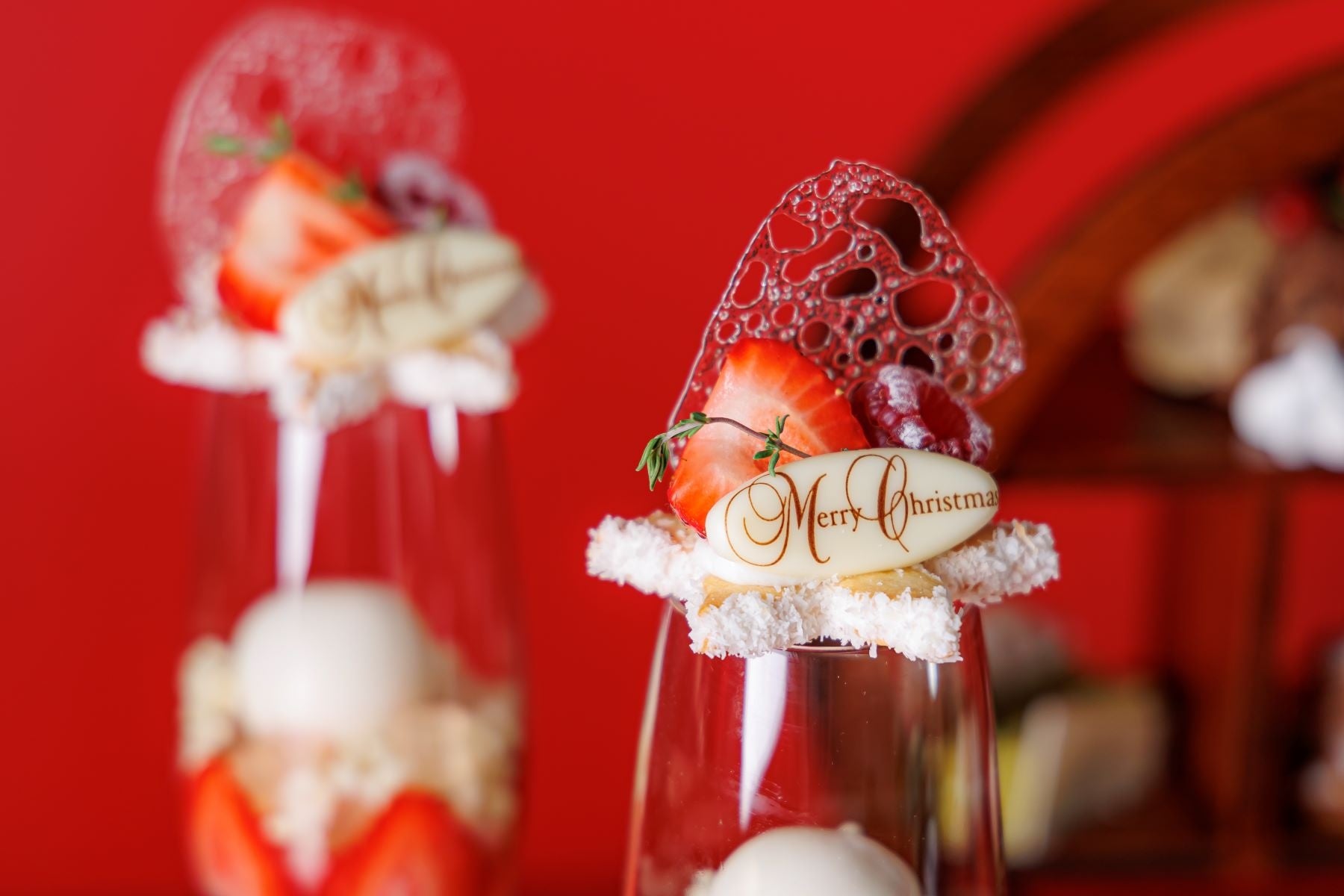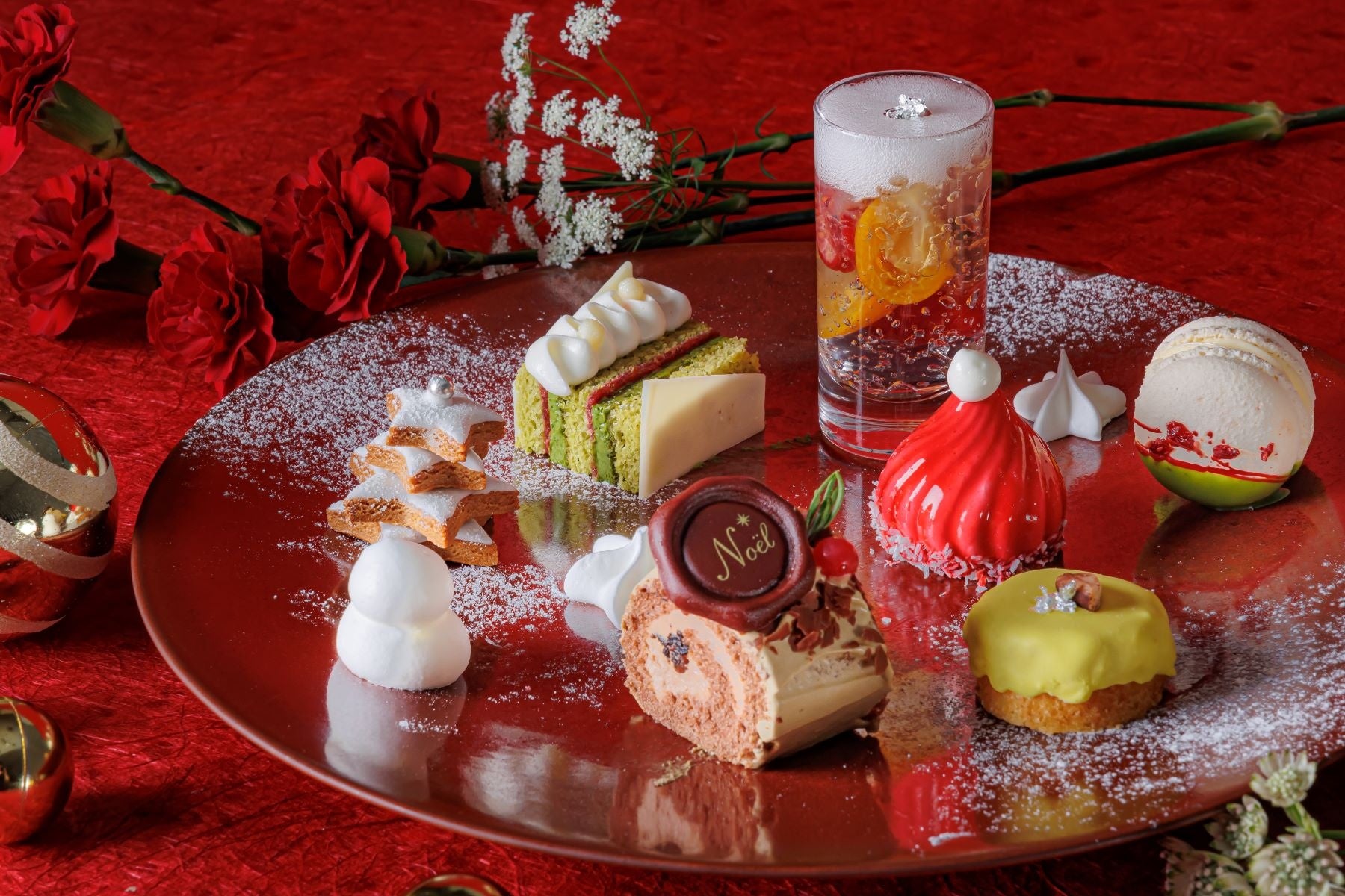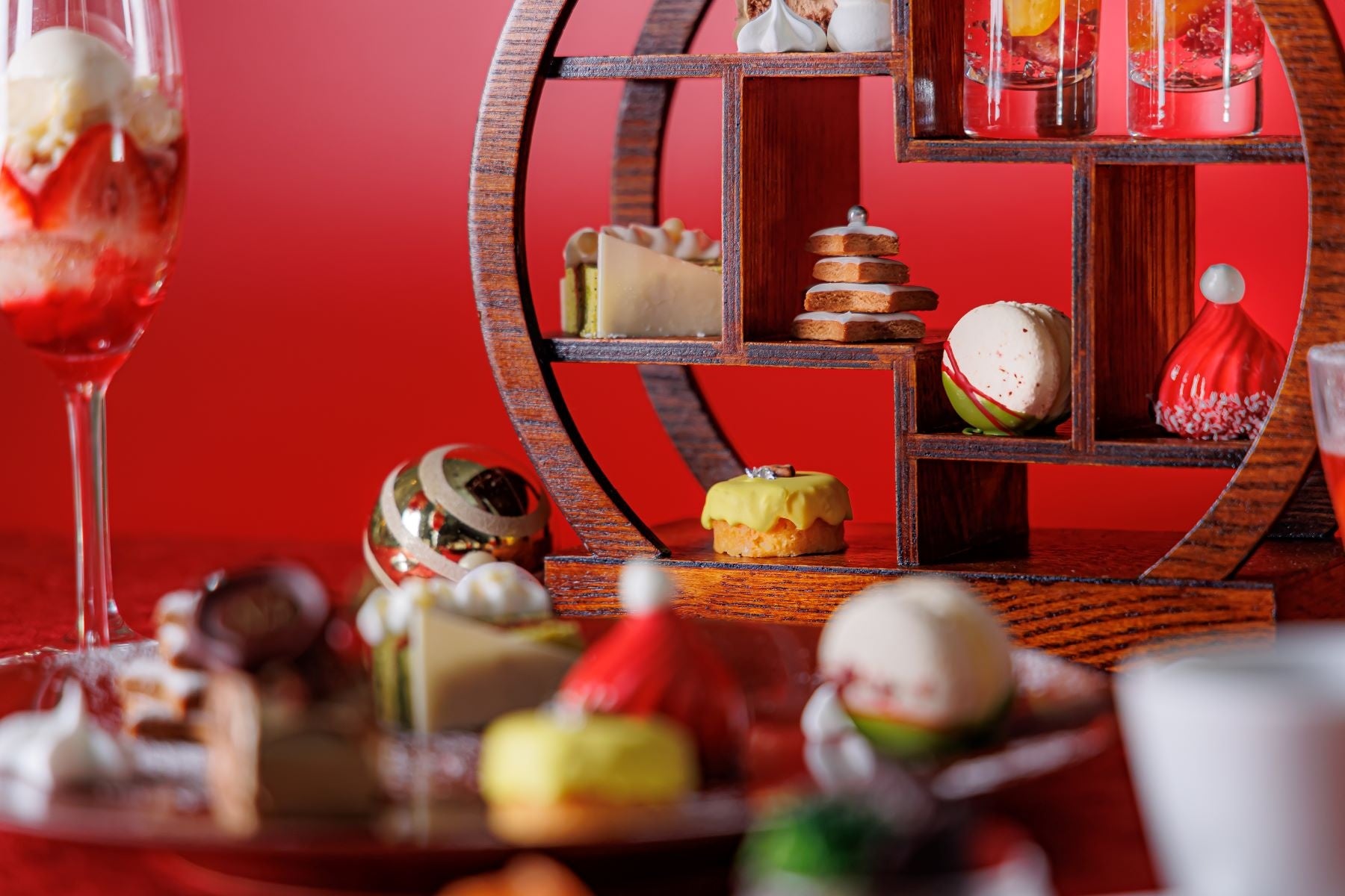 和と洋の食材を取り入れたスイーツ8種には、白ワインジュレや金柑のコンポートとラズベリーで仕上げたグラスデザートや、シナモン・ジンジャー・ナツメグ・コリアンダー4種のスパイスを使い雪が降り積もるクリスマスツリーに見立てたスペキュロス、可愛らしいサンタの帽子を表現した豆乳クリームを使用したラズベリームース、抹茶のバタークリームとラズベリージュレのオペラ、ほうじ茶とチョコレート2種のクリームのブッシュドノエル、バタークリームと酸味のあるラズベリージャムをサンドし抹茶と赤いチョコレートでクリスマスカラーにデザインしたマカロン、柚子ピールと和栗の渋皮煮とラム酒を加え深みのある大人な味わいのパウンドケーキなどをご用意。