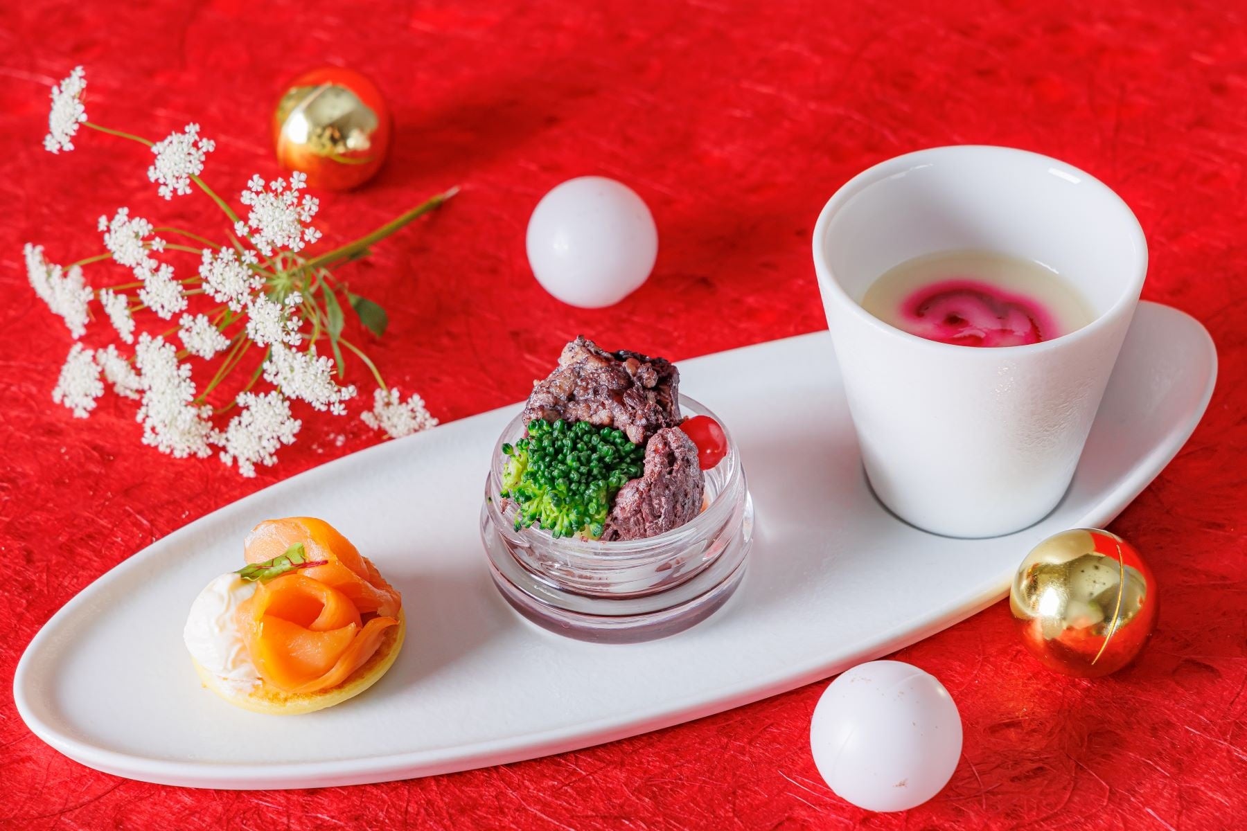 【セイボリー】蕪のポタージュ ビーツのピュレを浮かべて/じゃがいものパンケーキ サーモンとサワークリーム/牛肉の赤ワイン煮込み