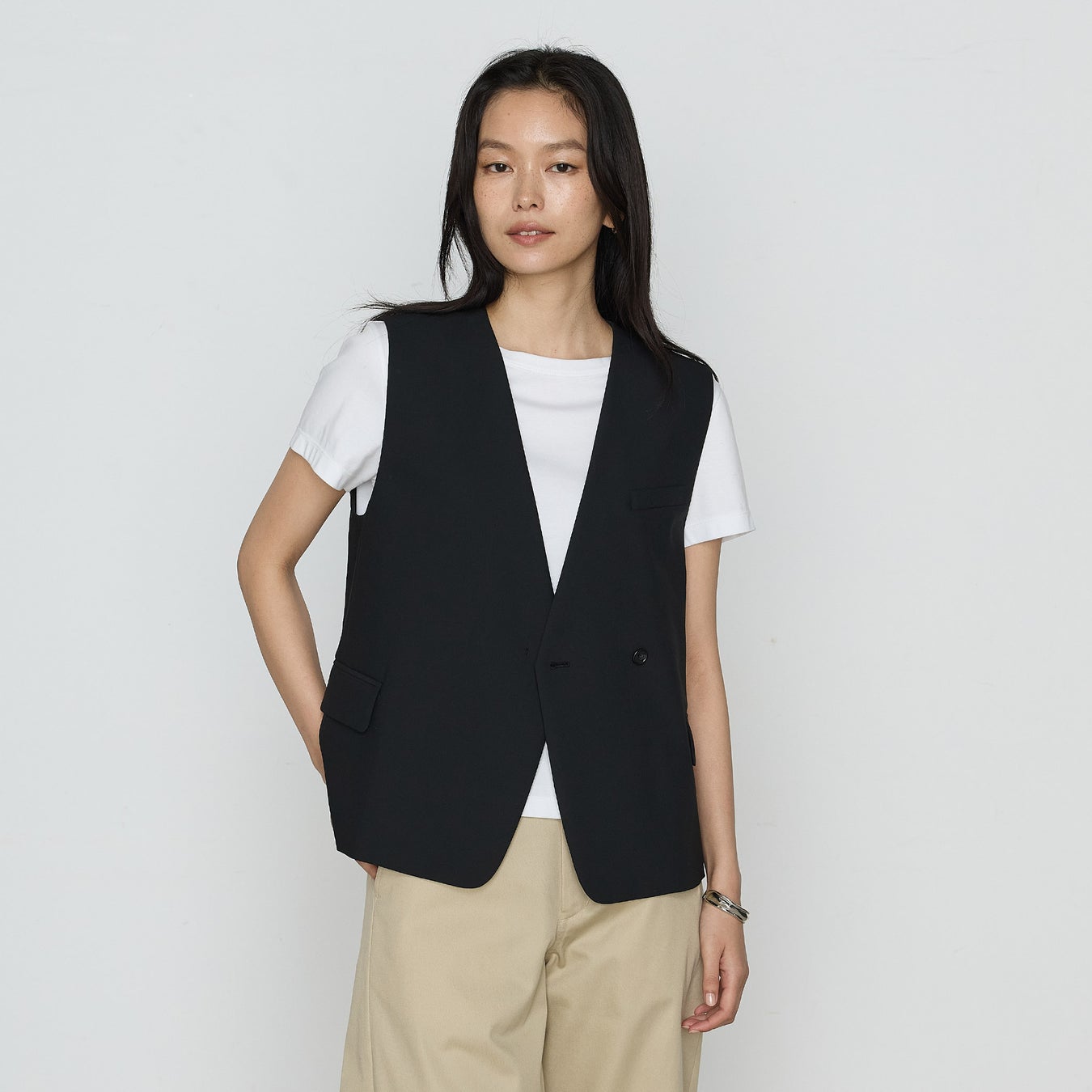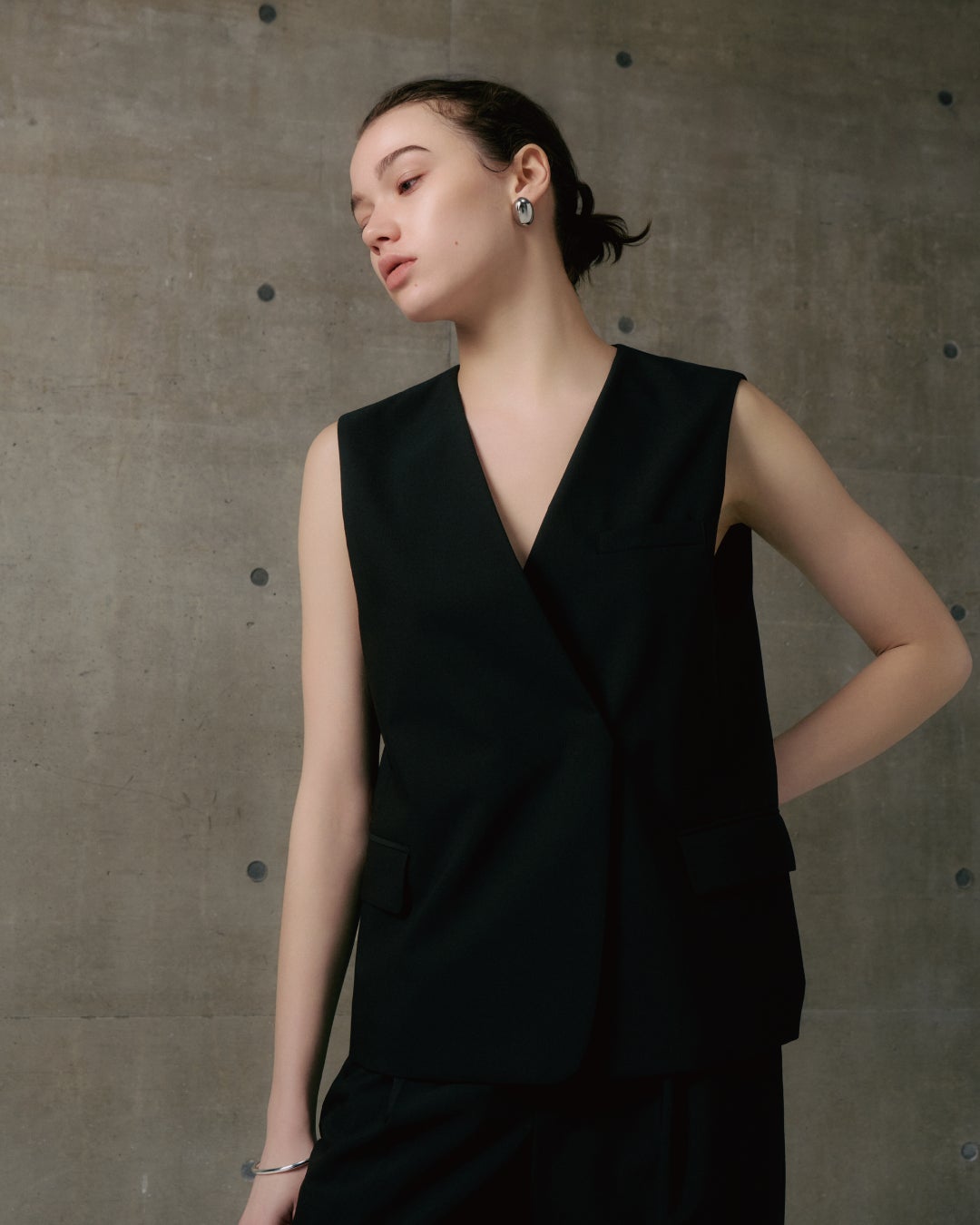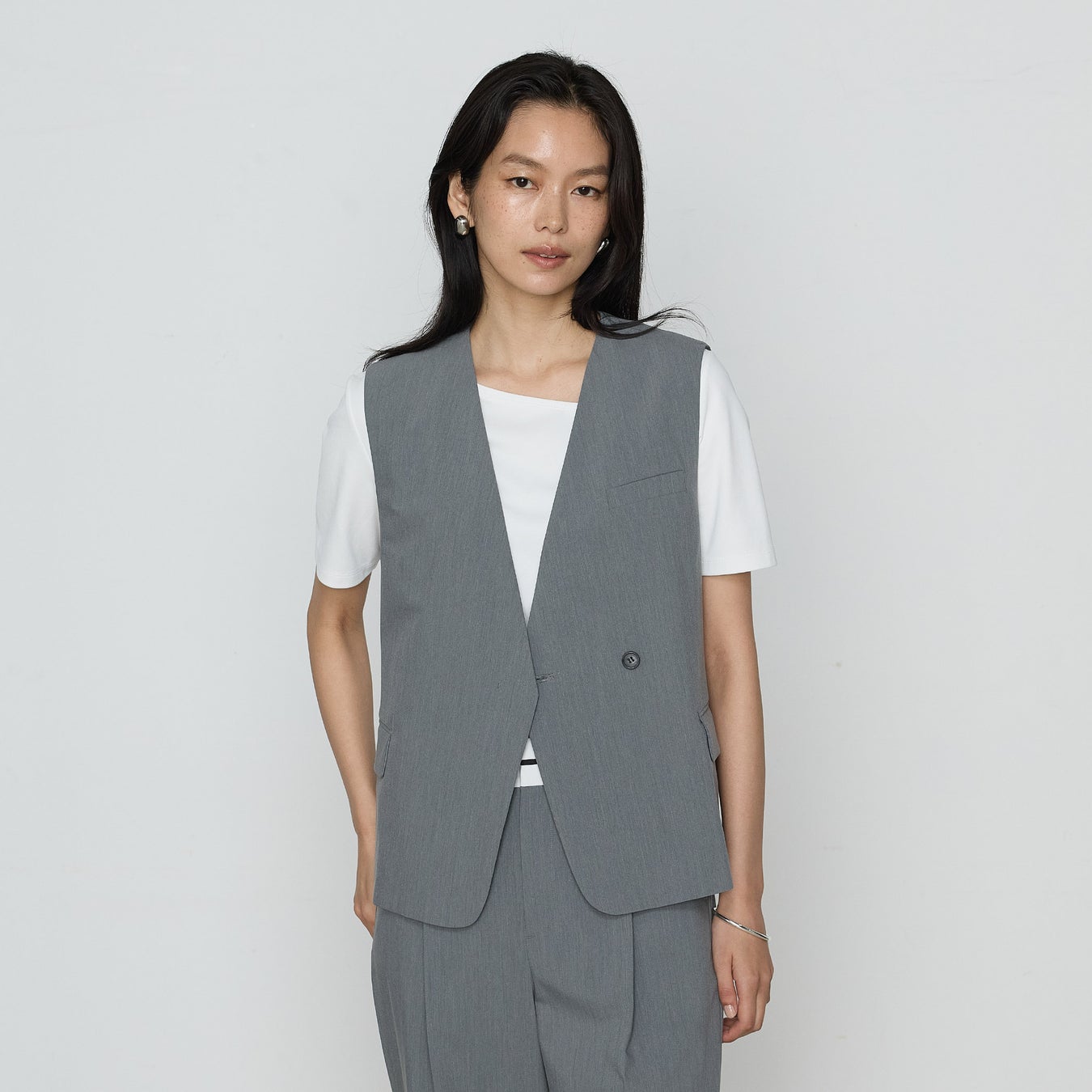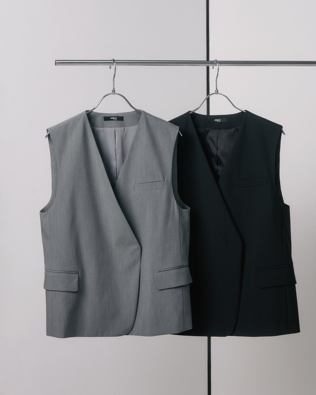ディテールを削ぎ落としたミニマルなノーカラージレ