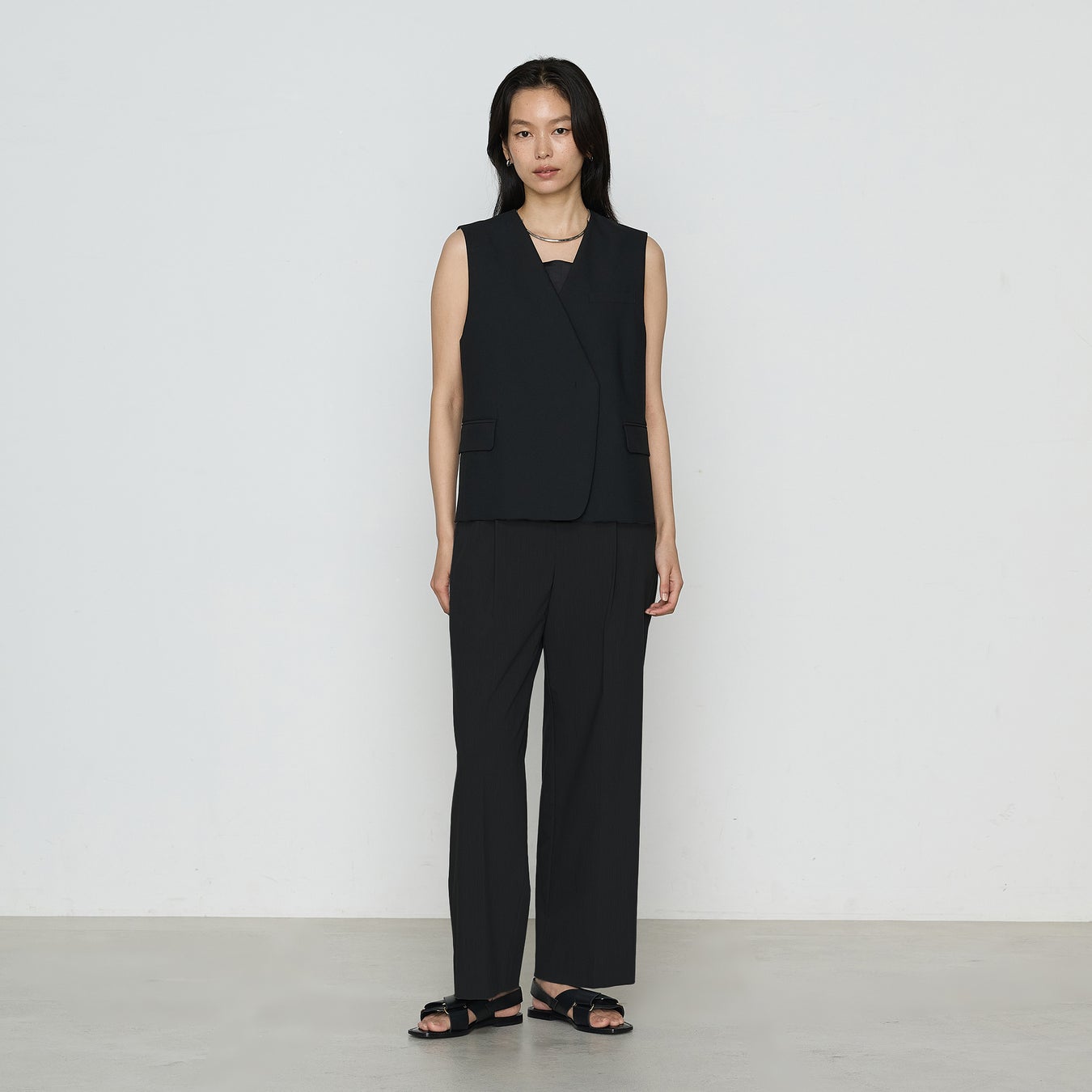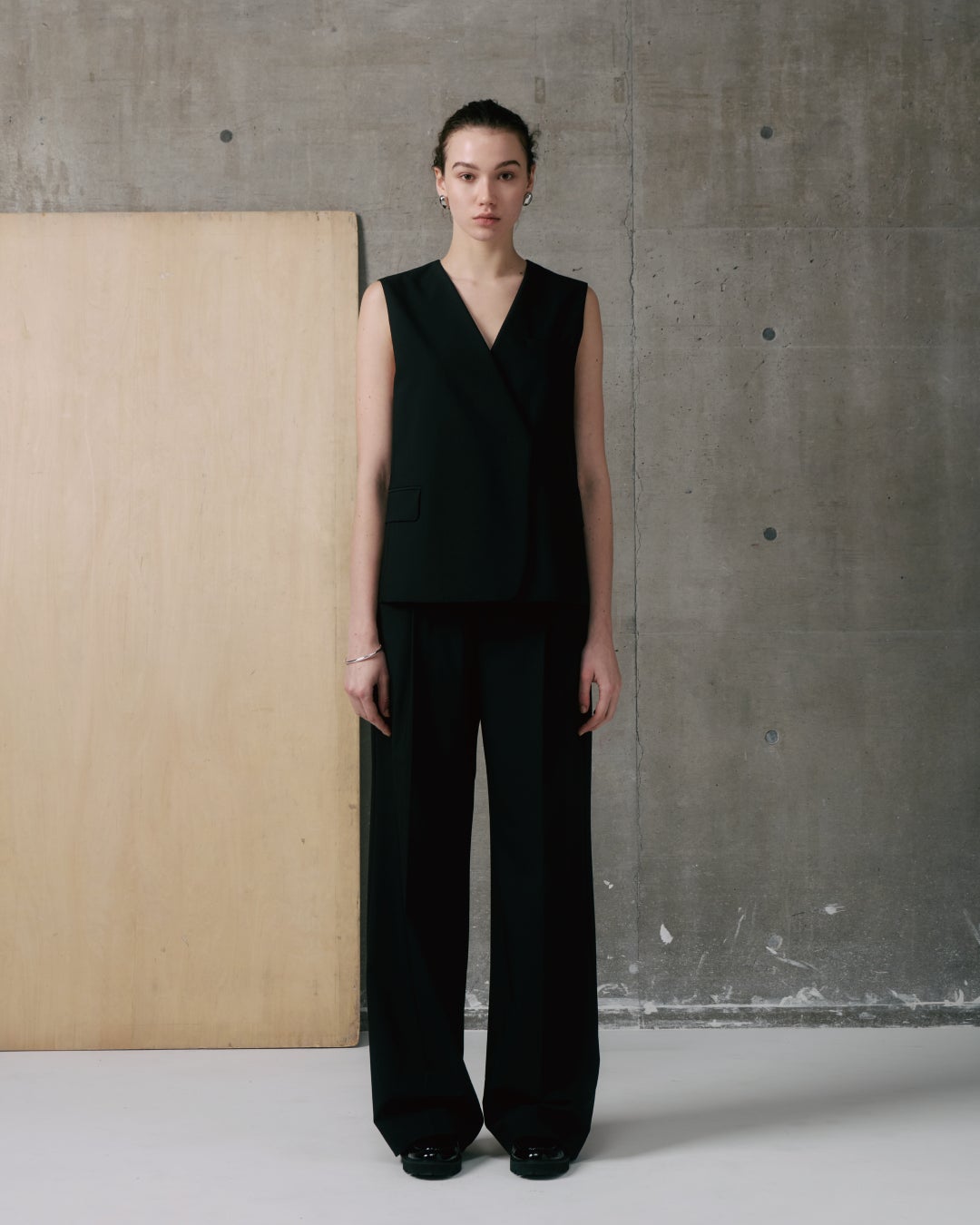 ジャケットよりも楽に着られて、きちんと決まるジレは、暑い季節もスマートな装いに導いてくれる優秀なアイテムです。今回は、クリアな表面感の素材で、ミニマルなジレとメンズライクなパンツをセットでつくりました。簡単に様になり、夏のオフィスシーンの味方になるジレアップです。