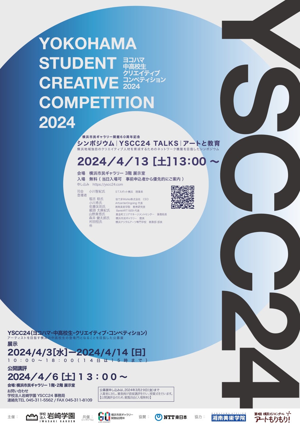2024年4月3日(水)~14日(日)に渡って開催される展示会「YSCC24 ヨコハマ・中高校生・クリエイティブ・コンペティション・2024」(主催:岩崎学園)会期中に主催者と当館が共催し、第8回横浜トリエンナーレ組織委員会が連携する形で「アートと教育」をテーマとしたシンポジウムを「開館60周年記念企画」と位置付け実施します。