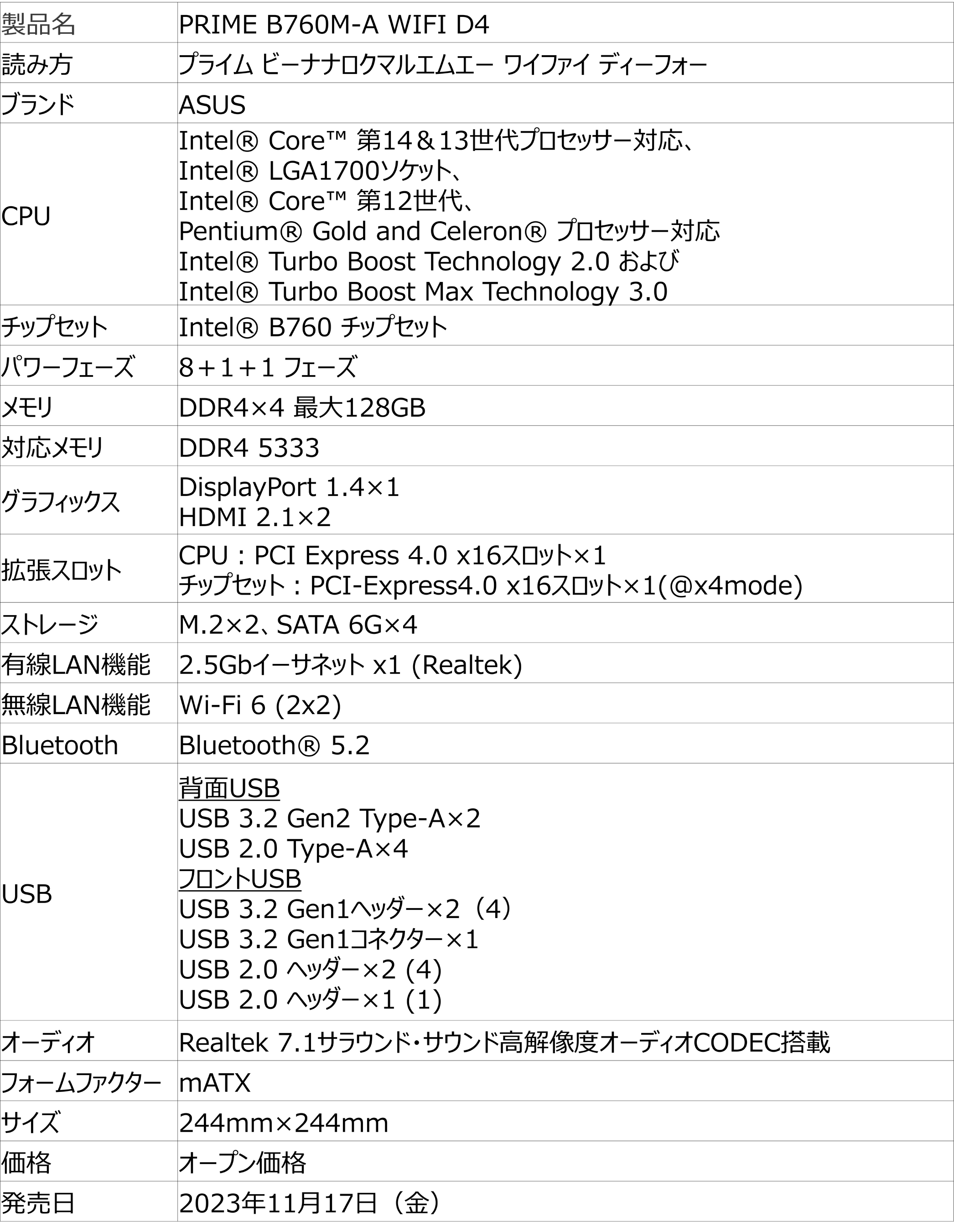 ASUSのPRIMEシリーズより第14世代インテル® Core™ プロセッサ対応インテル® B760チップセット搭載のAmazon専売マザーボード「PRIME B760M-A WIFI D4」を発表