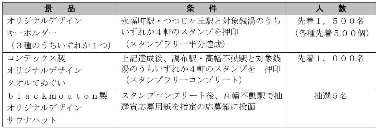 京王線・井の頭線の全駅とスタンプラリーの対象となる銭湯で配布するスタンプシートを持参の上、スタンプ設置駅と沿線にある31の対象銭湯を巡りスタンプを集めると、景品として人気デザイナー田渕周平氏がデザインしたオリジナルキーホルダー(2駅+銭湯4軒で達成)やコンテックス製オリジナルタオルてぬぐい(4駅+銭湯8軒で達成)をプレゼントします。さらに、すべてのスタンプを集め、高幡不動駅で対象の応募用紙を投函していただくと、5名様にオリジナルデザインのサウナハット(羊毛ハット作家 blackmouton製)が当たる抽選も実施します。