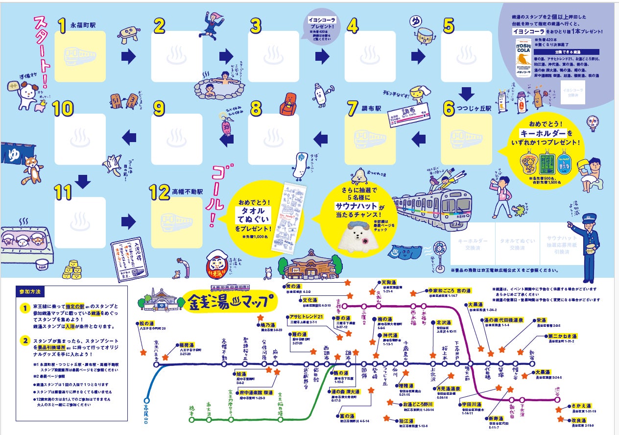 京王線・井の頭線の各駅とスタンプラリーの対象となる銭湯で配布するスタンプシートを持参の上、スタンプ設置駅と沿線の対象銭湯を巡り、合計4カ所の駅と8軒の銭湯のスタンプを集めます。集めたスタンプの数に応じて、先着で景品をプレゼントします。また、すべてのスタンプを集めると、オリジナルデザインサウナハットの抽選に応募ができます。