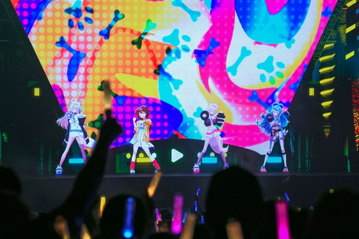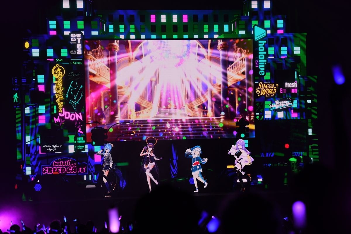 そのネオンが光る都会的なステージに降り立ったのは、一伊那尓栖、がうる・ぐら、ムーナ・ホシノヴァ、星街すいせいの4人。ポージングしながら颯爽と現れた彼女たちの姿に会場が沸くなか、星街すいせいのリードで2024年のVTuberシーンを代表する彼女のヒット曲「ビビデバ」を歌い始めると、歓声はさらに大きくなり熱狂の渦になる。ホロライブ、ホロライブインドネシア、ホロライブEnglish、それぞれのタレントたちがダンスしながらスタイリッシュに歌う姿は圧巻だった。