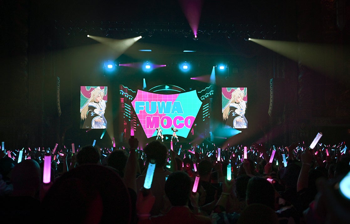続いてはPromiseのIRySが、「Carbonated Love」を披露。希望の歌姫である彼女らしい力強い歌声だけでなく、パラパラ風の動きを取り入れた振り付けで会場を沸かせる。そのギラついた世界観から一転、“カワイイ”に溢れたステージングでファンのハートを射抜いたのが、Adventの双子コンビ・FUWAMOCOことフワワ・アビスガードとモココ・アビスガード。ふわふわな尻尾を振りながら電波ソング調の「Born to be “BAU”DOL☆★」を披露し、キュートな歌と踊りで会場から盛大な“BAU BAU”コールを引き出す。