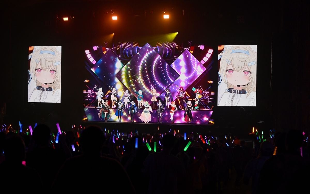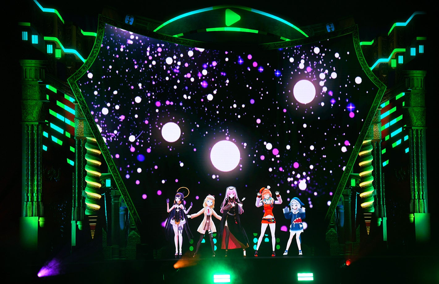 そしてIRyS、セレス・ファウナ、オーロ・クロニー、七詩ムメイ、ハコス・ベールズの5人からなるPromise全員が登場し、今年6月に発表されたばかりのユニット曲「Our Promise」をライブ初披露。リッチなオーケストラサウンドと伸びやかな5人のハーモニーが、悠久の時を経ても色あせることのない“約束(Promise)”への想いを描き出す。続いてセレス・ファウナがソロで歌ったのは、ジャパニーズシティポップの名曲「真夜中のドア~Stay With Me」(松原みき)。ファウナの憂いを帯びたボーカルも素晴らしいのはもちろん、サビで観客が大合唱するほど、海外でもこの楽曲が浸透していることにも驚かされた。