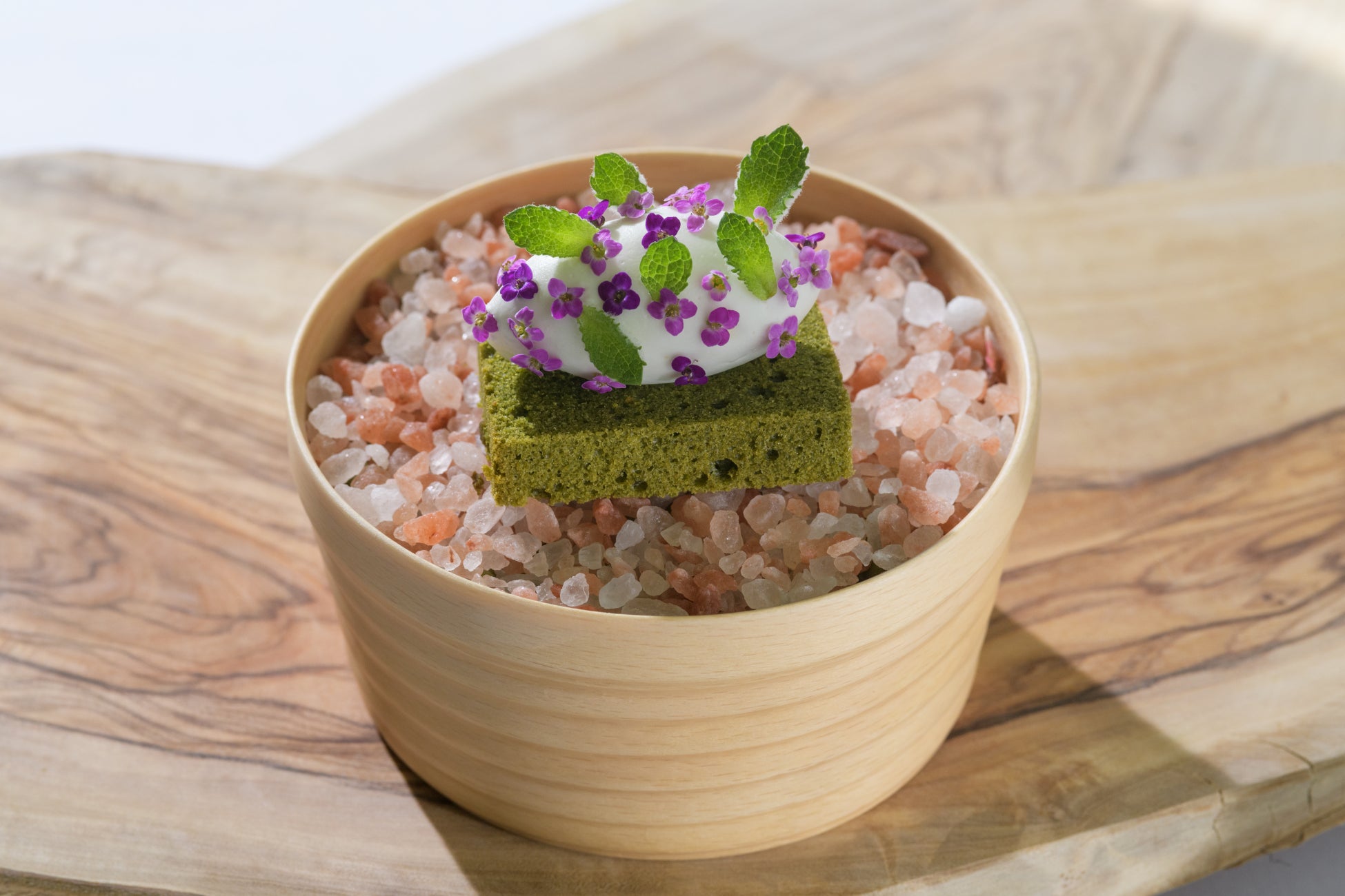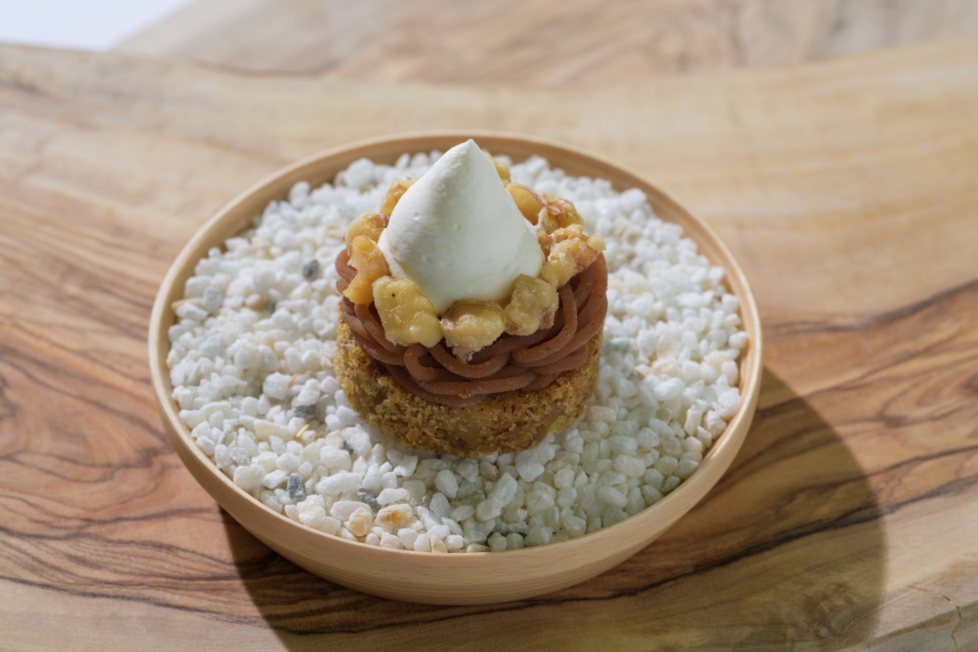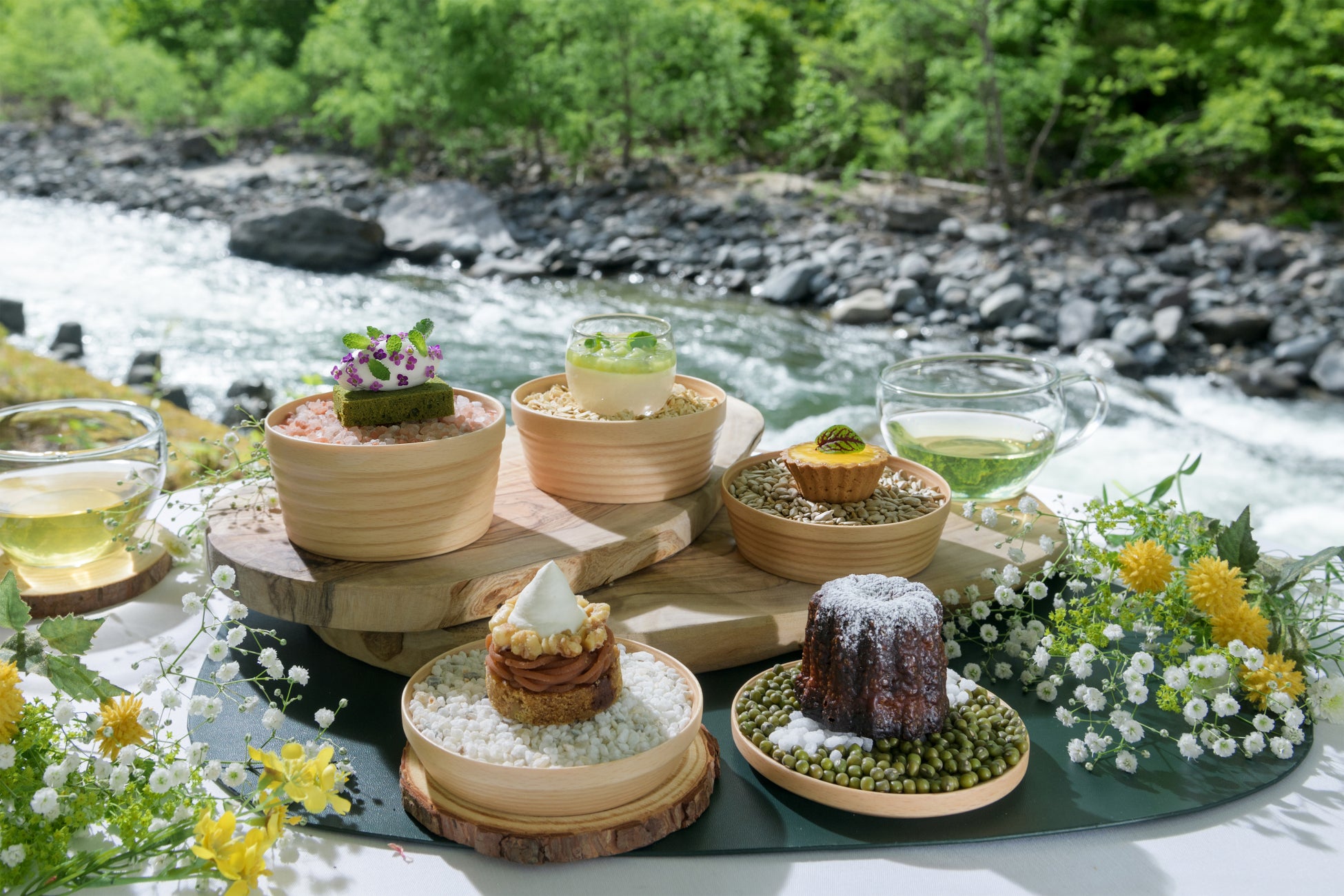 春の奥入瀬渓流は気温や天候、場所、時間によって景色が少しずつ変化します。そんな春の移り変わりを5種類のスイーツと3種類のホットティーで表現しました。スイーツの器は、奥入瀬渓流を代表する樹木「ブナ」を用いています。スイーツは、ナッツやロッシュ(*2)で春のザラメ雪の触感をイメージしたモンテビアンコをはじめ、ライムカードやミントで、芽吹きを表現したさっぱりとした味わいのタルトシトロンなど、新緑の景色をモチーフにしています。ドリンクは、芽吹いたときに見られる萌黄色の新緑をイメージしたホットティーを用意しました。見た目と爽やかな香りから春の移り変わりを感じられる、春の奥入瀬渓流ならではのアフタヌーンティーです。