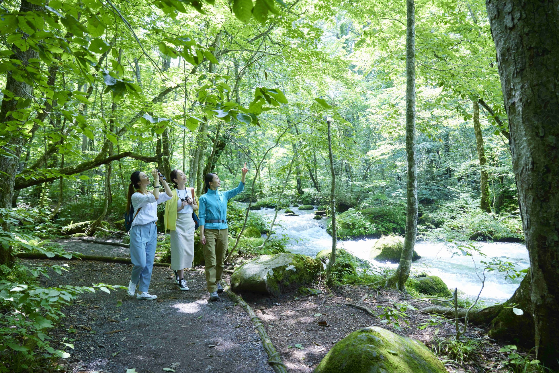 アフタヌーンティーを楽しむ前には、奥入瀬渓流の新緑のスポットを満遍なく堪能できる「渓流ガイドウォーク」の参加がおすすめです。奥入瀬渓流の自然を熟知した渓流コンシェルジュが、足元に咲く小さな花やきらめく新緑など、一期一会の景色を案内します。おいらせ新緑アフタヌーンティーのモチーフになった景色を楽しむことで、さらに豊かなアフタヌーンティーの時間を過ごせます。