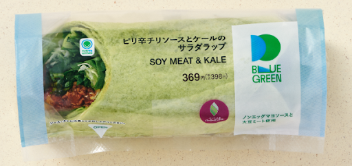 【内容】ケールと、大豆ミートを使用したチリソースが入ったサラダラップです。トルティーヤ生地にもケールを練りこみ、スーパー大麦やレッドキドニー、レタス、グリーンリーフ、キャベツ等を入れヘルシーに仕立てました。