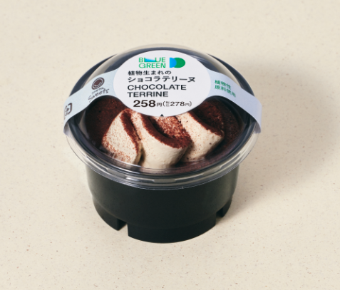 【内容】なめらかな食感のショコラテリーヌです。テリーヌには大豆素材のクリームバターを使用し、上のクリームにはアーモンドホイップを使用しています。植物由来の原料に変更しながらも、チョコレートの味わいを楽しんで頂けます。
