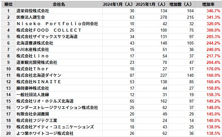 「誰もが活躍できる仕組みをつくる。」をミッションに掲げ、セールスチームの武器となるデータベース「SalesNow」を展開する株式会社SalesNow(本社:東京都渋谷区、代表取締役:村岡功規、以下「SalesNow」)は、国内550万社の企業情報を完全網羅した日本最大級のデータベース「SalesNow DB」より、北海道に本社を置く企業の2024年1月時点および2025年1月時点の従業員数データを分析し、従業員数増加率ランキングTOP20を発表しました。本ランキングは、各企業の成長スピードを可視化するものであり、新規雇用の創出や事業拡大の動向を明らかにしています。
