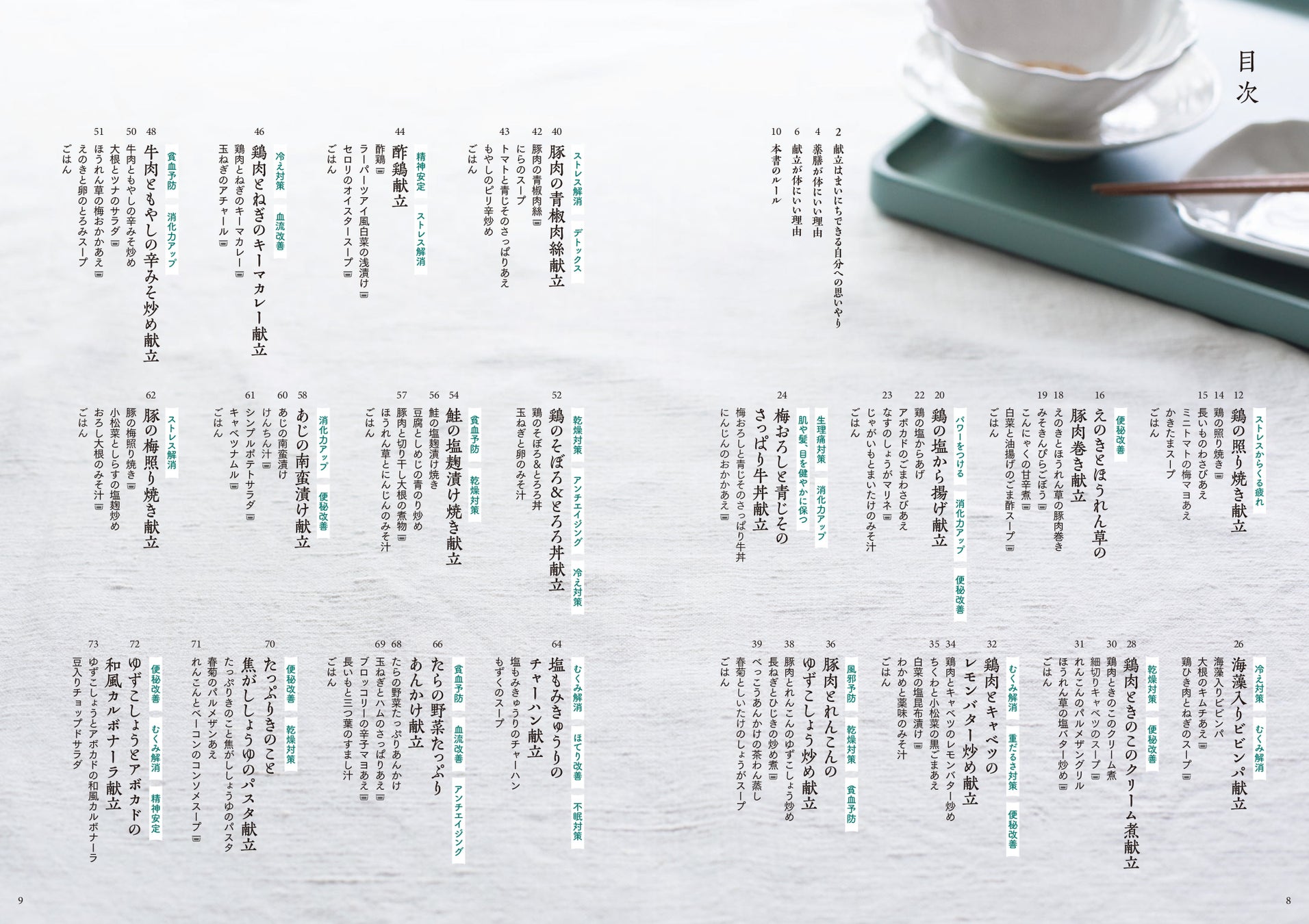 ストレスからくる疲れにぴったりの「鶏の照り焼き献立」や、便秘改善に役立つ「えのきとほうれん草の豚肉巻き献立」など計24献立紹介。健康やその日の体調に合わせて選べます。