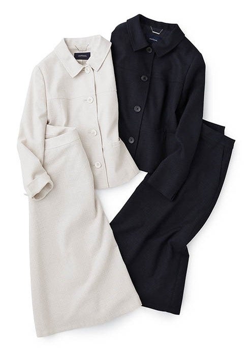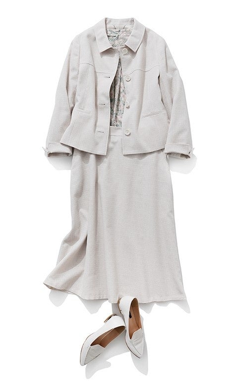 ニュアンスある目面のブッチャー素材が、春らしい軽さと華やかさを演出。単品アウターとしても使えるコンパクトなジャケットと、膝がしっかり隠れるセミロング丈のスカートは、縦長ラインを叶えてくれるバランスです。