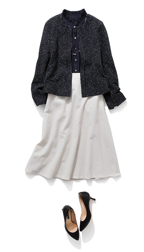 ハレの日には欠かせない、ツィードジャケットとの相性もバッチリ。ドットドビーのフリルブラウスで、よりエレガントな雰囲気をプラス。立体感のある生地は、ネックレス一つで十分な華やかさを演出してくれます。