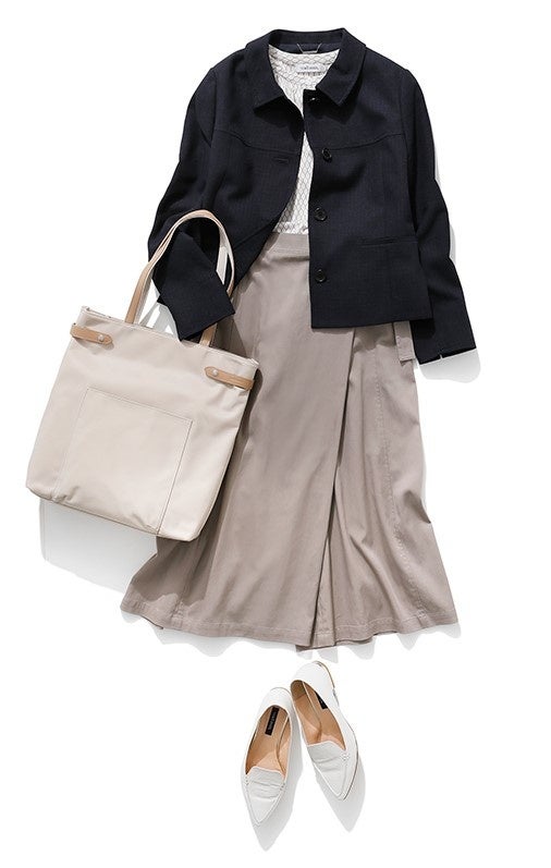ジャケットはアウター代わりにさっと羽織って。ニュアンスカラーのベージュとアイボリーをセレクトすれば、お仕事スタイルも春らしい印象に。スカートライクなパンツなので、通勤などの移動時もスムーズ。