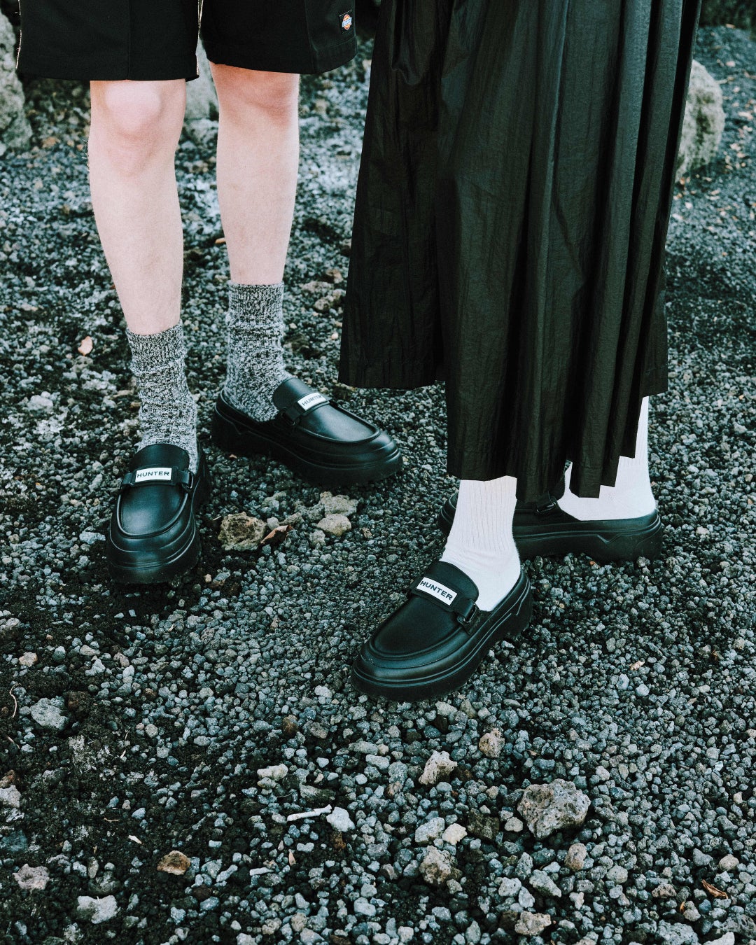 英国の老舗ブランドHUNTER と ADAM ET ROPE' の別注アイテム第一弾 ブラックフレームのロゴが目を惹くローファーミュールが発売