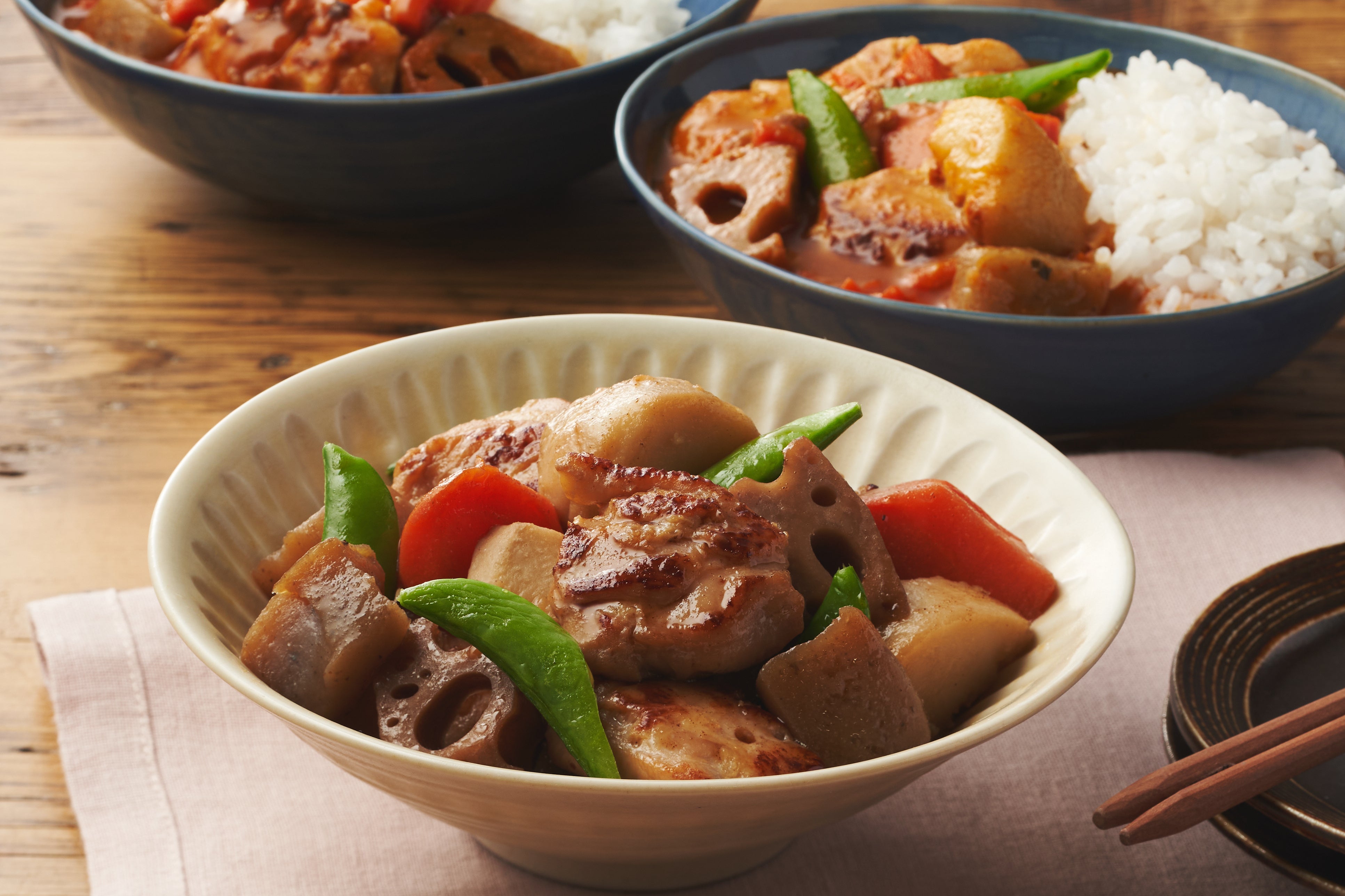 勝男のような料理初心者にも簡単に、おいしく作っていただけるよう、里芋やレンコンなどの根菜は下ゆで済み、かつ下味付きにすることで、煮込み時間を大幅に短縮しました。また、ドラマのストーリーに沿って料理も楽しんでいただけるよう、勝男が失敗した筑前煮を、同僚の白崎(前原瑞樹さん)がカレーにリメイクするシーンもミールキットで再現。半量を筑前煮としてお召し上がりいただいた後、ドライトマトカレーの素を加えることで、筑前煮の出汁にトマトの旨みが加わった、普段とは少し違う和風のカレーもお楽しみいただけます。
