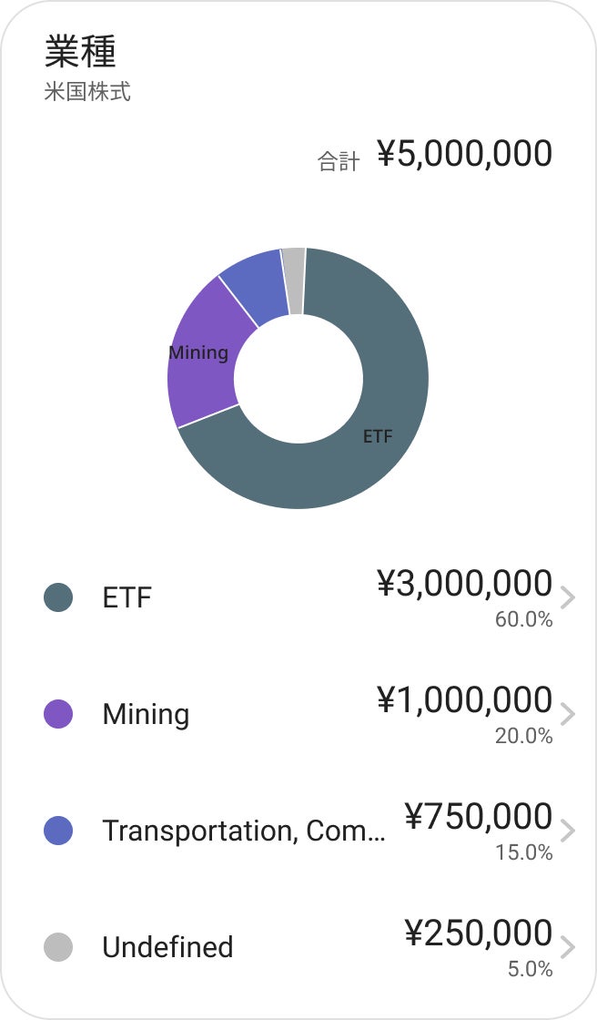 これまで「ポートフォリオ」ページ内の業種別ポートフォリオ「米国株式」では、ETFの分類が円グラフ内で表示されないという課題がありました。ユーザーの皆さまからも改善のご要望を頂いていたことから、独立した一つの業種としてETFを自動分類、表示させることができるようアップデートを行いました。また今回のアップデートに伴い、ETFの業種別ページも作成され、各銘柄の詳細な状況を確認することができるようになります。今後もユーザーの皆さまの貴重なご意見をもとに、本コースの改善を継続し、個人投資家の皆さまにお役立ていただける「見える化」の実現と、ユーザー体験の向上を目指してまいります。