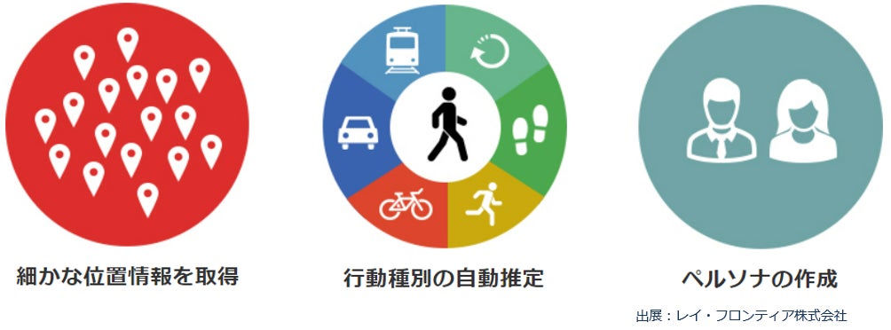 本サービスは、平均3~5秒毎の位置情報取得による詳細な行動データの収集と、独自のアルゴリズムを用いた分析技術に定評のあるレイ・フロンティア株式会社(以下:レイ・フロンティア)との協業により、精緻な移動手段や行動の流れが分かるきめ細やかなロケーションデータをもとに人々の行動分析を行い、そのデータと分析レポートを提供します。
