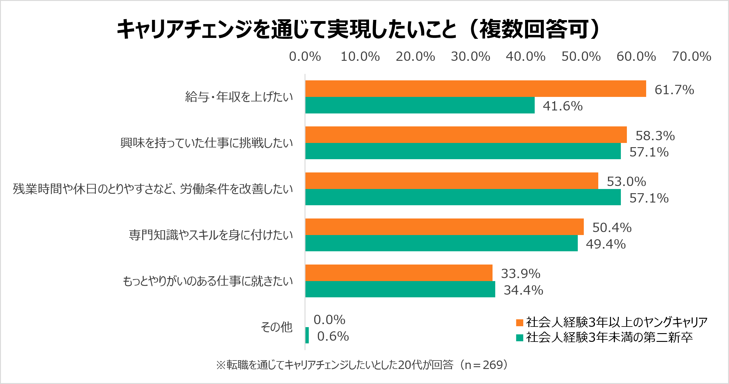 経験業種・職種と異なる仕事に挑戦する「キャリアチェンジ」を通じて実現したいことは、社会人経験3年以上の「ヤングキャリア」と、社会人経験3年未満の「第二新卒」で異なる結果となりました。ヤングキャリアは、「給与・年収を上げたい」が61.7%で最多。次いで、「興味を持っていた仕事に挑戦したい」58.3%が続きました。関心のある仕事に挑戦する他、業種や職種を変えることで年収を上げたいという意向がうかがえます。一方、第二新卒は「興味を持っていた仕事に挑戦したい」、「残業時間や休日のとりやすさなど、労働条件を改善したい」が、同割合の57.1%で最多となっています。