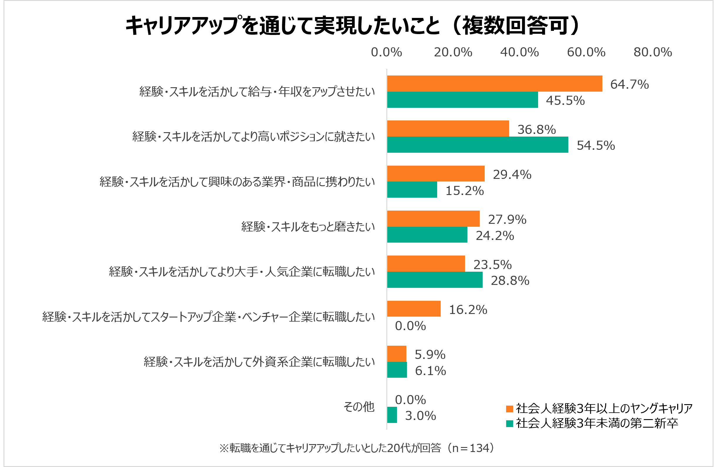 社会人経験3年以上の「ヤングキャリア」が、キャリアアップを通じて実現したいことは「給与・年収をアップさせたい」が64.7%で最多。次いで、「より高いポジションにつきたい」36.8%、「興味のある業界・商品に携わりたい」29.4%が続きました。一方、社会人経験3年未満の「第二新卒」が、キャリアアップを通じて実現したいことは「より高いポジションに就きたい」が54.5%で最多。次いで、「給与・年収をアップさせたい」45.5%、「大手・人気企業に転職したい」28.8%が続きました。