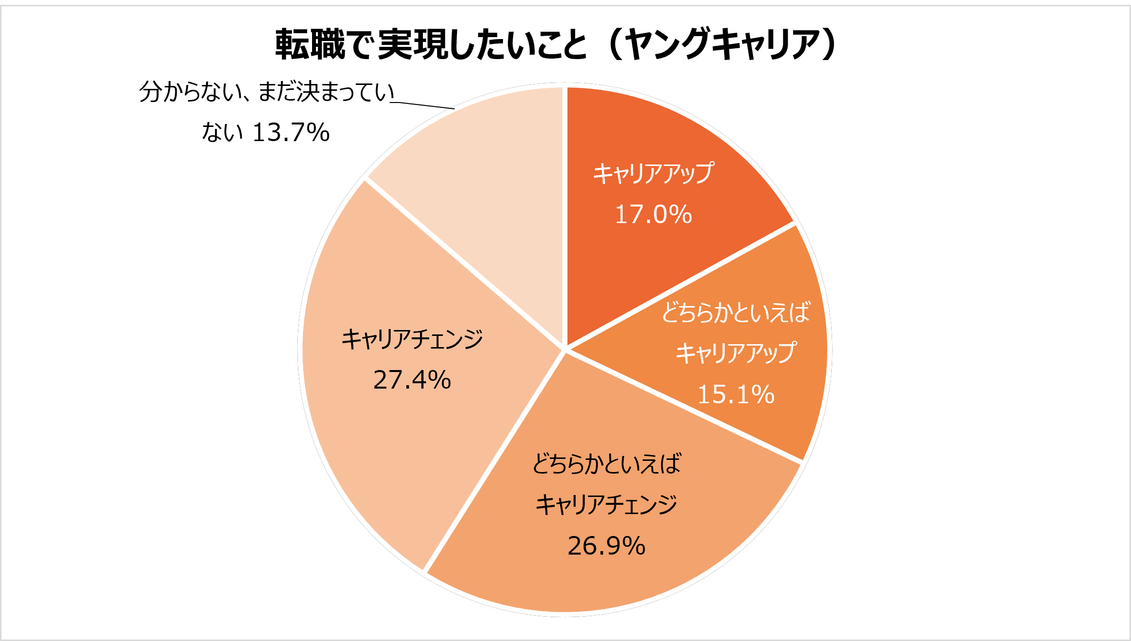 転職において、「キャリアアップ」よりも、経験業種・職種とは異なる仕事に挑戦する「キャリアチェンジ」を希望する20代が多いことが明らかになりました。社会人経験3年以上の「ヤングキャリア」は、54.3%が「キャリアチェンジ」を希望。約半数は、経験業種・職種と異なる仕事への挑戦を希望していることが分かります。「キャリアアップ」を希望する割合は、32.1%でした。