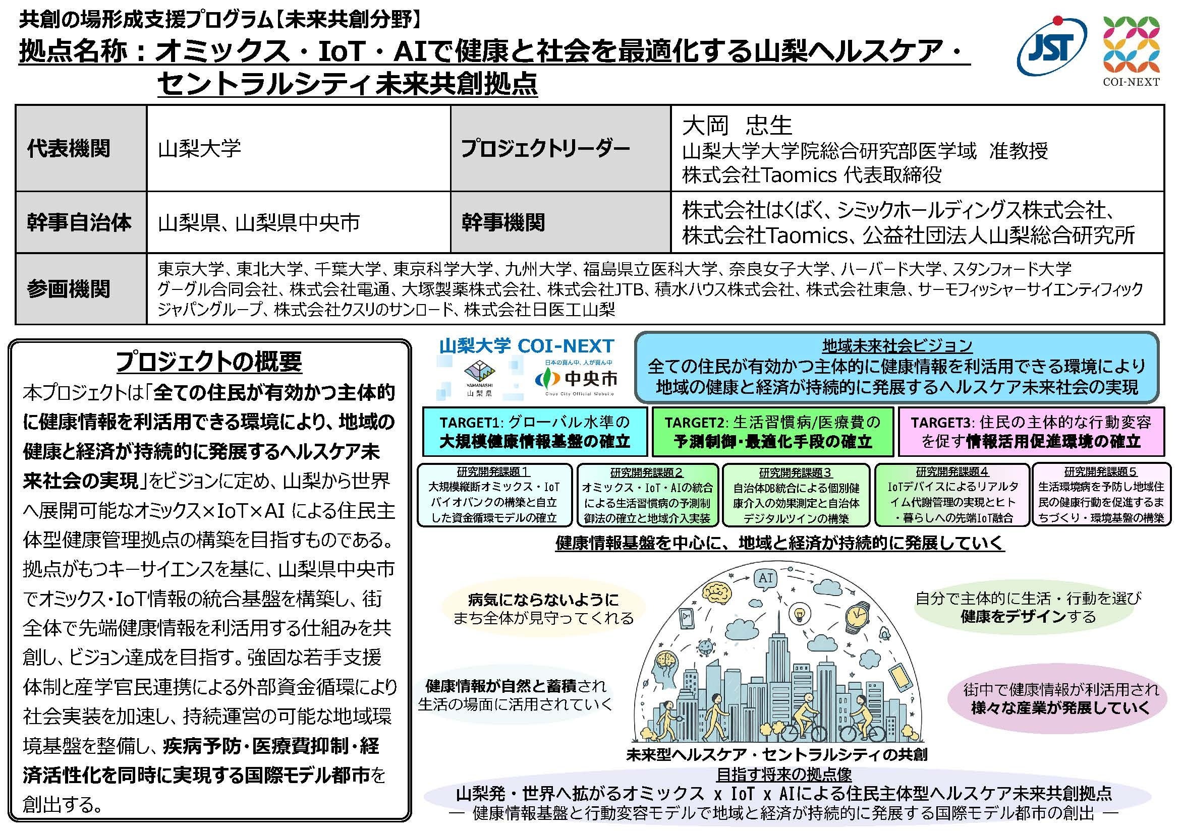 千葉大学(プロジェクト参加者:大学院医学研究院 川上 英良 教授)が参画している、山梨大学を代表機関(プロジェクトリーダー:大学院総合研究部 大岡 忠生 准教授)として提案したプロジェクト「オミックス・IoT・AIで健康と社会を最適化する山梨ヘルスケア・セントラルシティ未来共創拠点」が、国立研究開発法人科学技術振興機構(JST)が公募した「共創の場形成支援プログラム(COI-NEXT)未来共創分野(フェーズ1)」に採択されましたことをお知らせいたします。