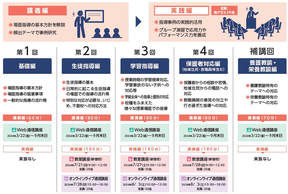 当ゼミでは、場面指導の基本的な方針や一般的な指導の流れを確認した上で、試験で問われや すい頻出のテーマについて、望ましい回答の方向性を考察します。どんなテーマが出されても、ふさわしい指導方法を瞬時に選択できるような応用力を備えて本番を迎えましょう。