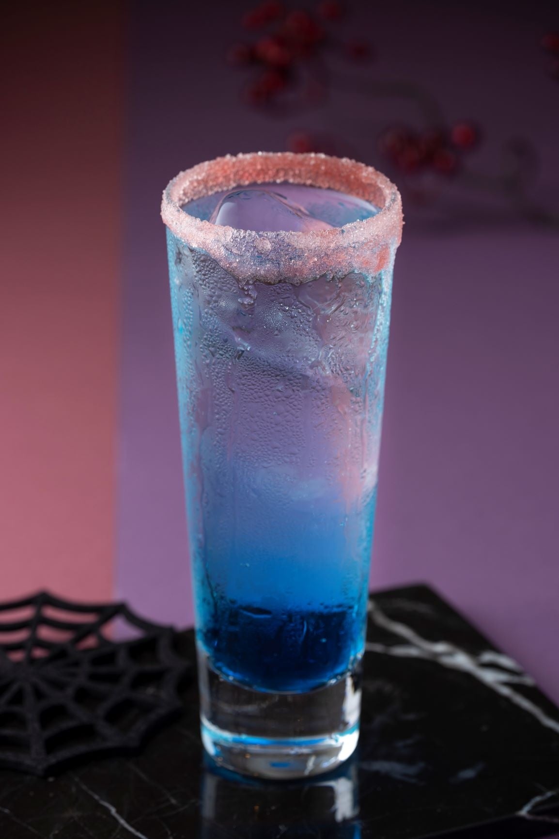 ブルーキュラソーで月夜をイメージしたライチリキュールベースのさっぱりしたロングカクテル。・ヴァンパイアノアール
