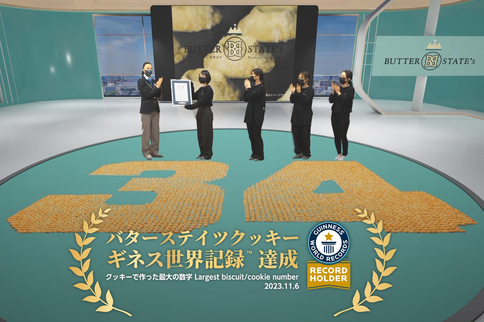バター含有率34%を誇る、究極のバターリッチクッキーが誕生したことを記念して、バタースイーツ専門店『バターステイツ』がギネス世界記録に挑戦。その結果、バターステイツの代表作 「バターステイツクッキー THEバターリッチ」3450枚を使って、縦3.1m、横4.5mの大きさの「34」という数字を作ることに成功。見事「クッキーで作った最大の数字/Largest biscuit/cookie number」に認定されました。