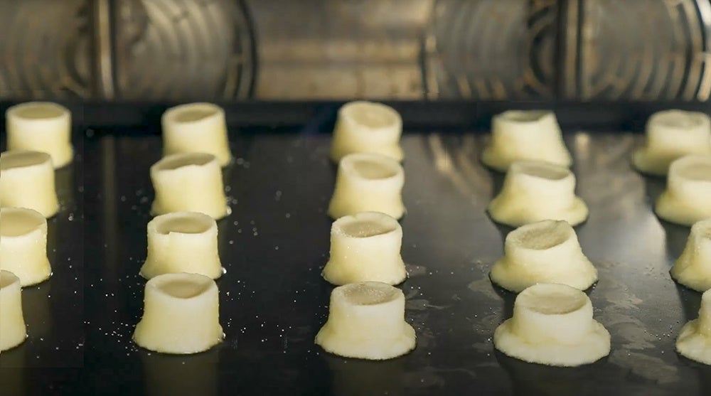 高配合バター生地は窯の熱で大量のバターがとろけだし、生地全体がなだれをうって広がりはじめます。その最良のポイントで焼き止める。これが、独自の「バターなだれとろけ製法」です。できあがるのは、王冠のような印象的な姿。豊富なバターの誇りの印です。