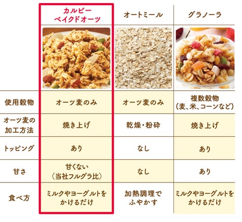 ●「ベイクドオーツ」は、カルビー独自のベイクド製法でオートミールをおいしく焼き上げ、フルーツやナッツをトッピングしたシリアルです。甘くない※3、香ばしいオーツ麦のおいしさがそのまま味わえるので、飽きずに食べることができます。