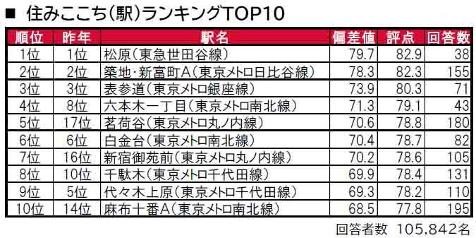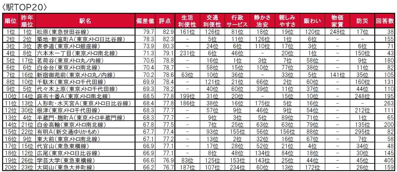 1位は2年連続で、世田谷区に位置する松原(東急世田谷線)です。2位は2年連続で、中央区に位置する築地・新富町A【(東京メトロ日比谷線)(築地・東銀座・築地市場・新富町の近隣4駅を統合)】です。3位は2年連続で、港区に位置する表参道(東京メトロ銀座線)です。トップ10内では、5位に文京区に位置する茗荷谷(東京メトロ丸ノ内線)(昨年17位)、7位に新宿御苑前(東京メトロ丸ノ内線)(昨年16位)、10位に麻布十番・赤羽橋の近隣2駅を統合した麻布十番A(昨年14位)が昨年から順位を上げてランクインしています。