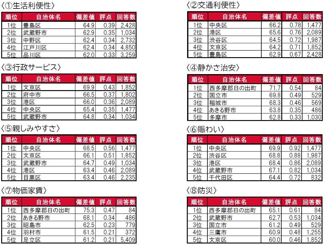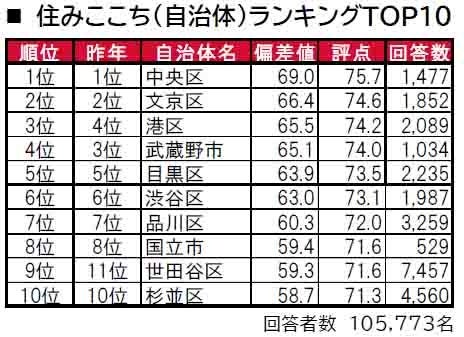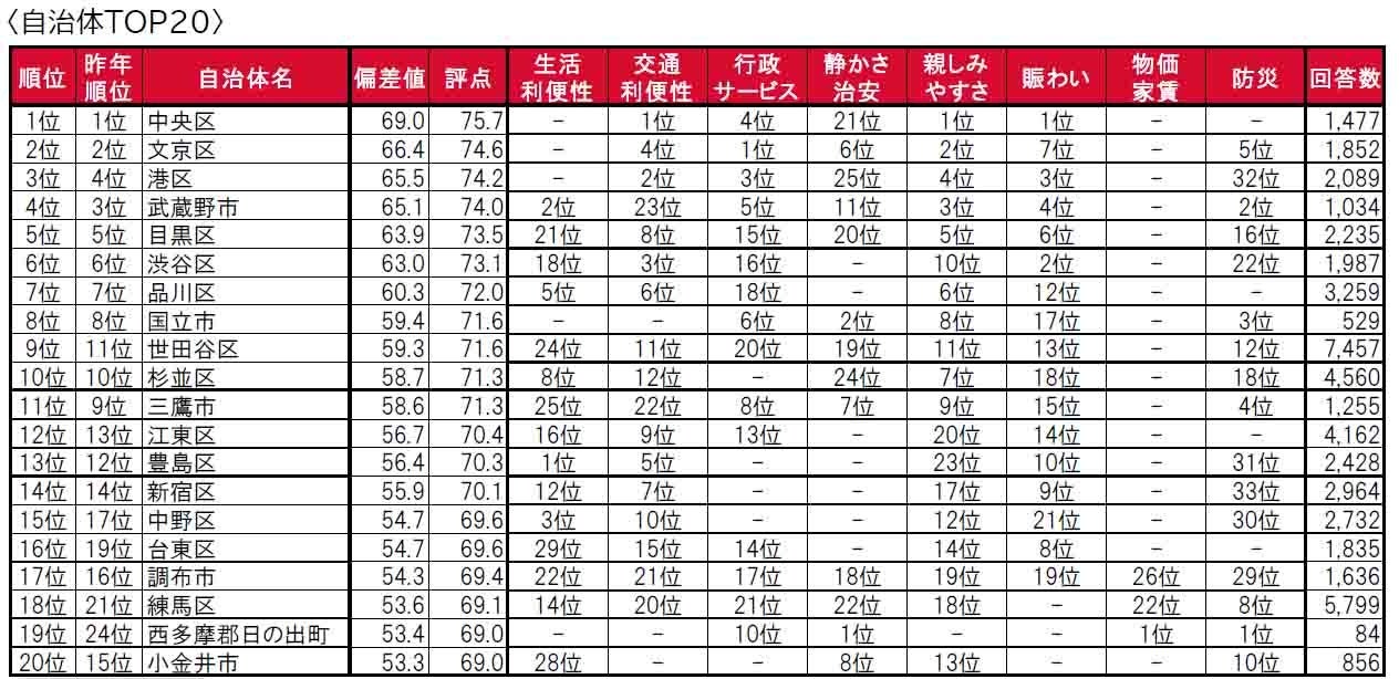 トップ2は6年連続で、1位は中央区、2位は文京区です。3位は港区です。トップ20内では、18位に練馬区(昨年21位)、19位に西多摩郡日の出町(昨年24位)が昨年から順位を上げてランクインしています。
