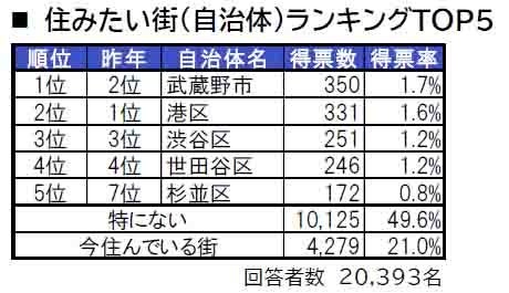 1位は武蔵野市、2位は港区です。3位は、2年連続で渋谷区です。「住みたい街(自治体)」は、東京都在住者が全国の自治体を対象に住みたい街を選んでいますが、4位は世田谷区、5位は杉並区で、トップ5は全て東京都の自治体となっています。