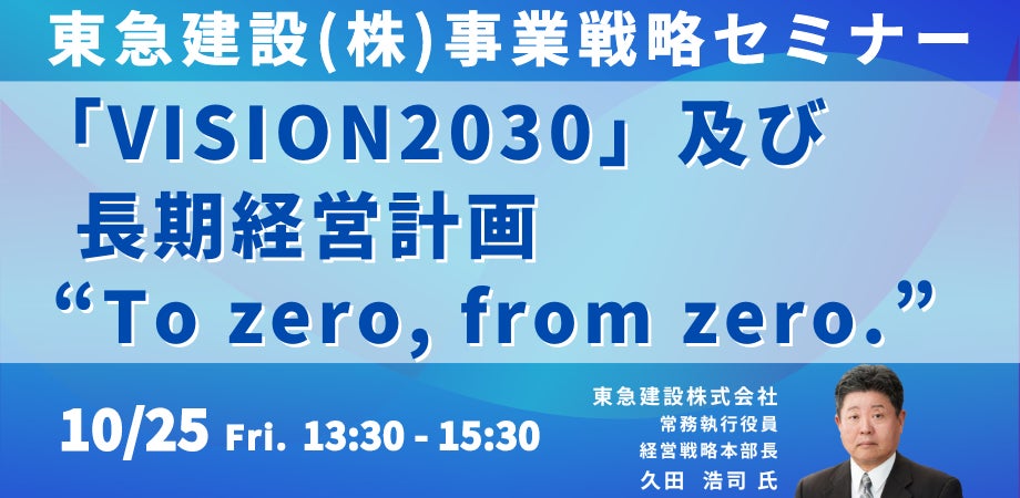 JPI(日本計画研究所)は、東急建設株式会社 常務執行役員 経営戦略本部長 久田 浩司 氏を招聘し、東急建設の「VISION2030」及び 長期経営計画“To zero, from zero.”について詳説いただくセミナーを開催します。
