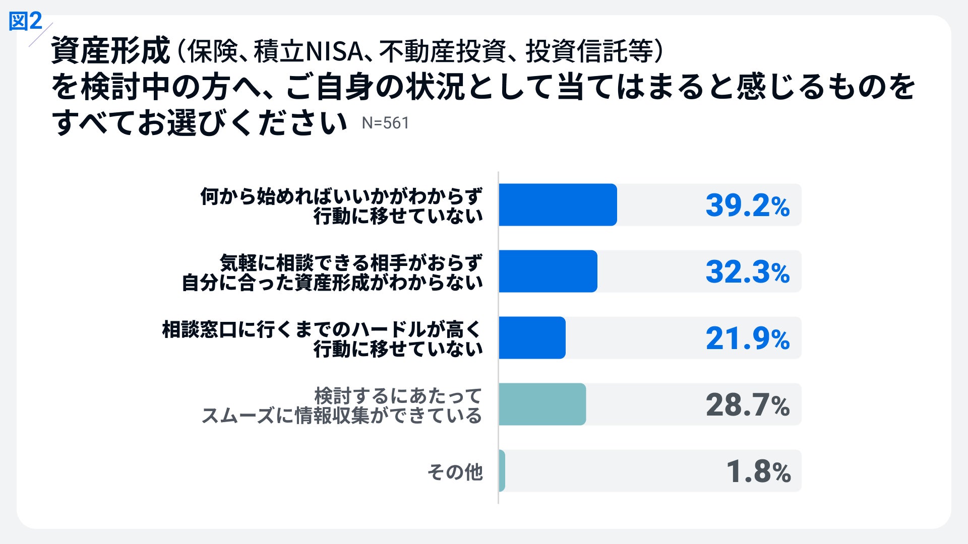 2023年8月に400Fが実施した「資産形成(保険、積立NISA、不動産投資、投資信託等)への興味関心に関するアンケート」(※2)によると、約半数が資産形成への興味関心があるという回答結果となりました(図1)。2024年は新NISA制度もスタート予定となっており、今後より一層「貯蓄から投資へ」の流れは加速し、資産形成への関心は高まっていくことが予想されます。一方で、多くの方は「何から始めればいいかがわからない」や「相談相手がいない」などが原因で、資産形成に関心があっても、行動に移せていないようです。