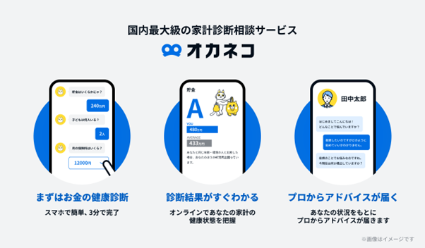 スマホから居住地や年齢、年収、家族構成などの質問に答えるだけで、同地域・同年代の人と比較し、ユーザーの家計状況を診断。その後、診断結果をもとにFP(ファイナンシャルプランナー)やIFA(金融商品仲介業者)等のお金のプロからアドバイスコメントが届き、ユーザーはチャットで気軽に相談することができるオンラインサービスです。